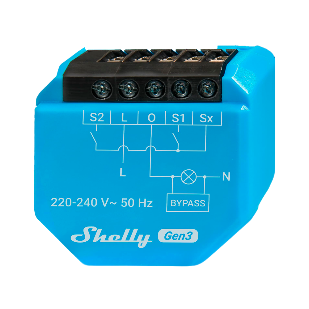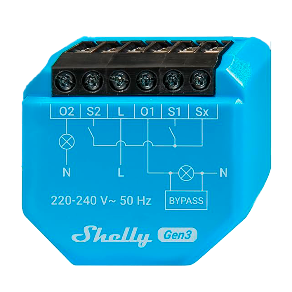 Shelly 2L Gen3 – WiFi 2.4 GHz IEEE802.11 b/g/n / Bluetooth – Interruptor inteligente / Sin Neutro – Soporta 220-240 V~50Hz – Bypass 1L/2L – Compatible con Alexa y Google