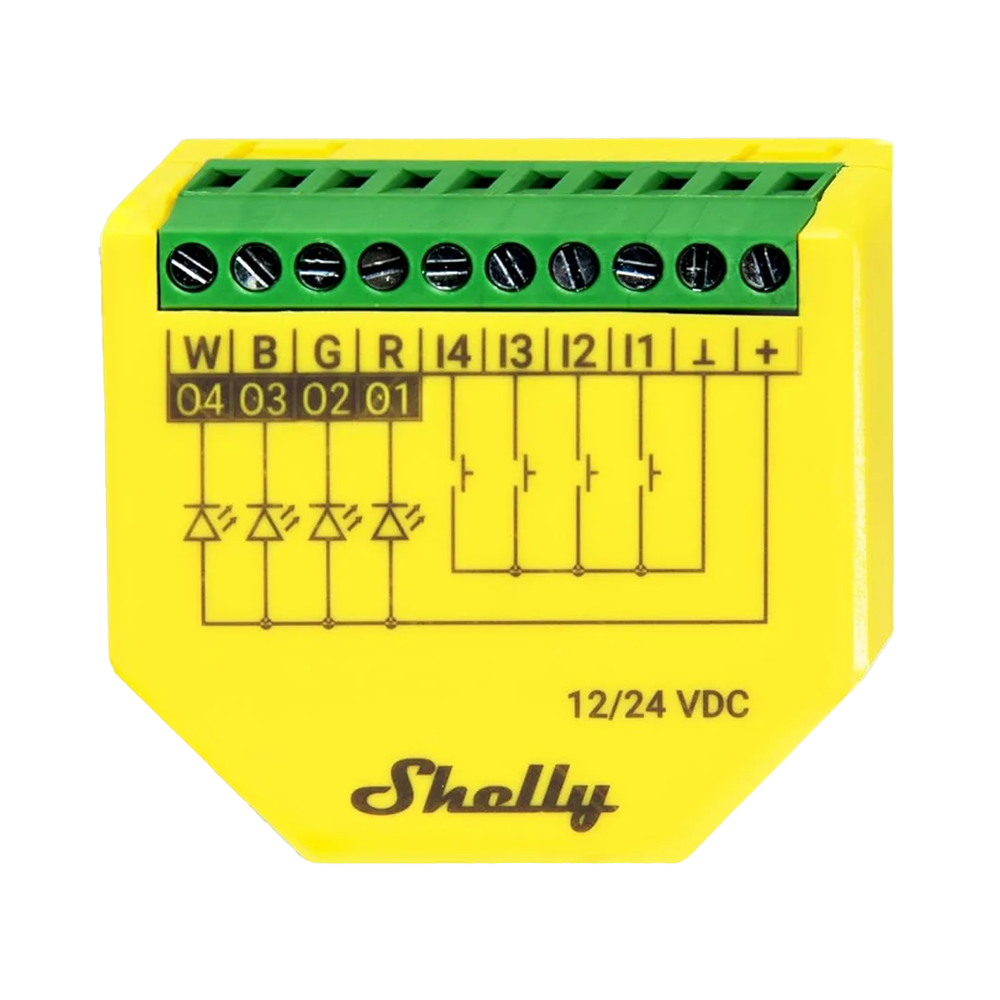 Shelly Controlador RGBW para tiras LED – WiFi 2.4 GHz IEEE802.11 b/g/n / Bluetooth – Admite cualquier tira de LED RGB/RGBW – Soporta 12V / 24V – Medición de potencia – Compatible con Alexa y Google