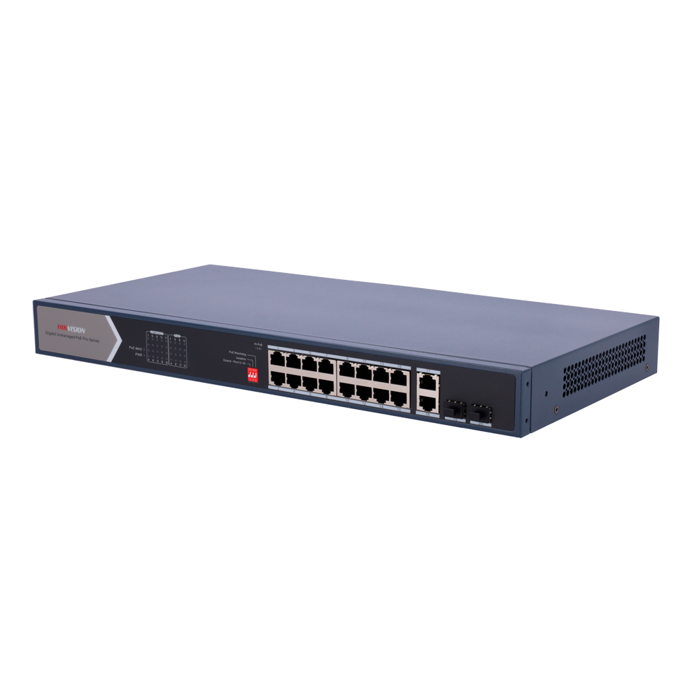 Switch PoE Hikvision – 18 puertos RJ45 Gigabit + 2 puertos Gigabit SFP – 12 Puertos PoE+ 802.3af/at + 4 Puertos Hi-PoE – Hasta 225w de Potencia PoE Total – PoE Extendido / PoE Watchdog / Port Isolation – Enrackable
