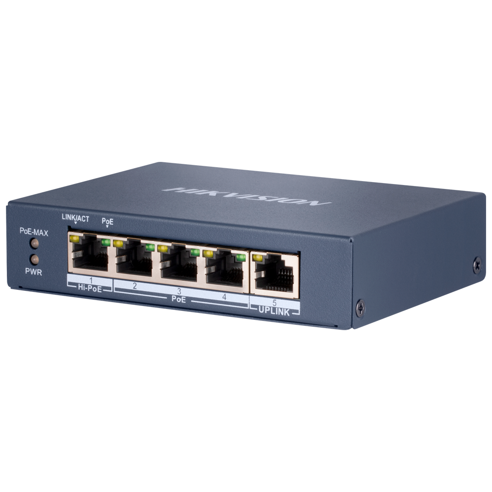 Switch PoE Hikvision – 4 RJ45 Gigabit + 1 uplink Gigabit RJ45 – 3 PoE+ 802.3af/at + 1 Hi-PoE 802.3af/at/bt – Hasta 60w de Potencia PoE Total – PoE Extendido / PoE Watchdog / Port Isolation – Instalación en sobremesa