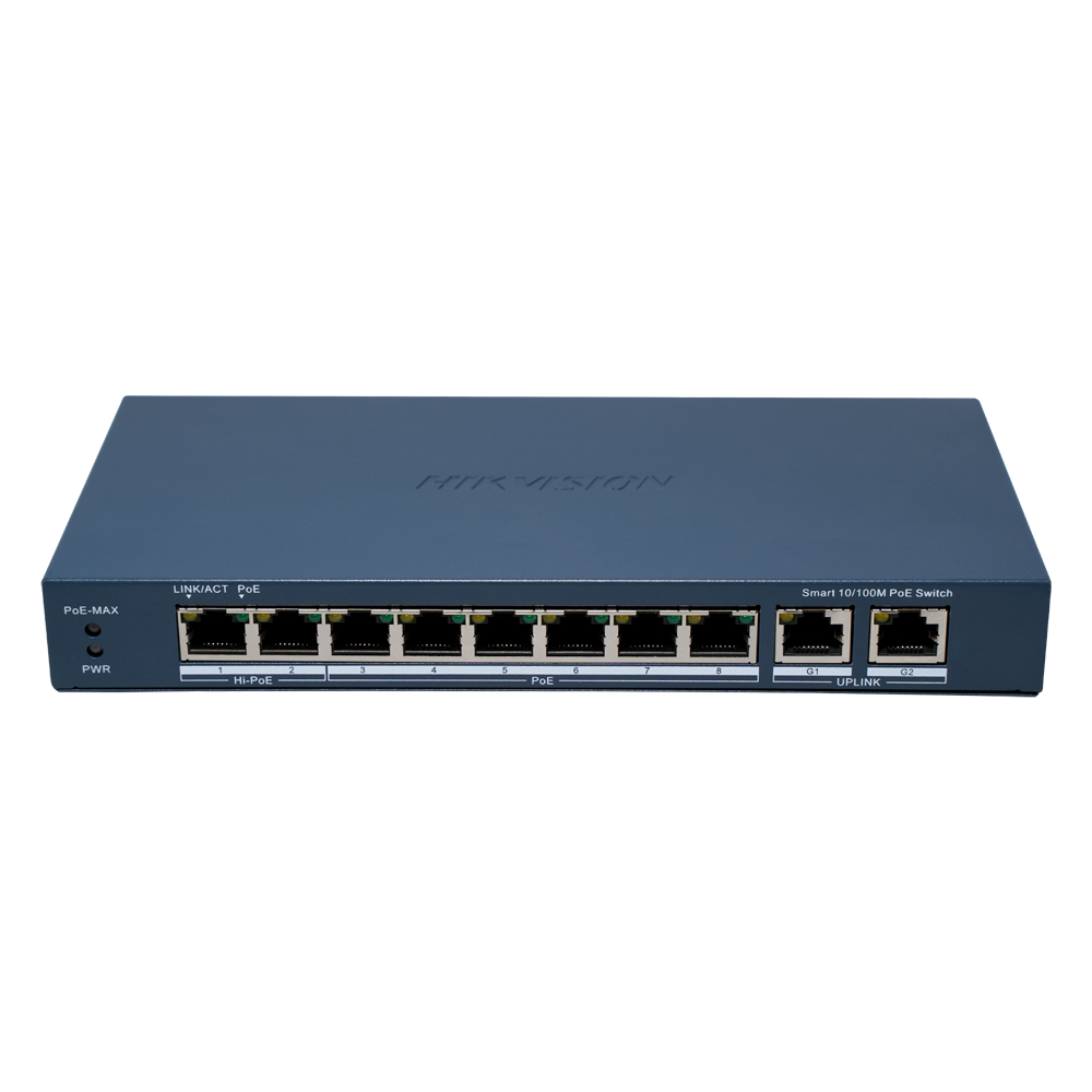 Hikvision HiPoE Switch Gestionable – 8 puertos PoE 802.3af/at + 2 Uplink RJ45 – 8 RJ45 10/100 Mbps + 2 RJ45 10/100/1000 Mbps – 802.3af/at/bt / Máximo 110W – VLAN/Port Isolation/Loop Detection/LLDP – Link Aggregation/PoE Watchdog/SNMP