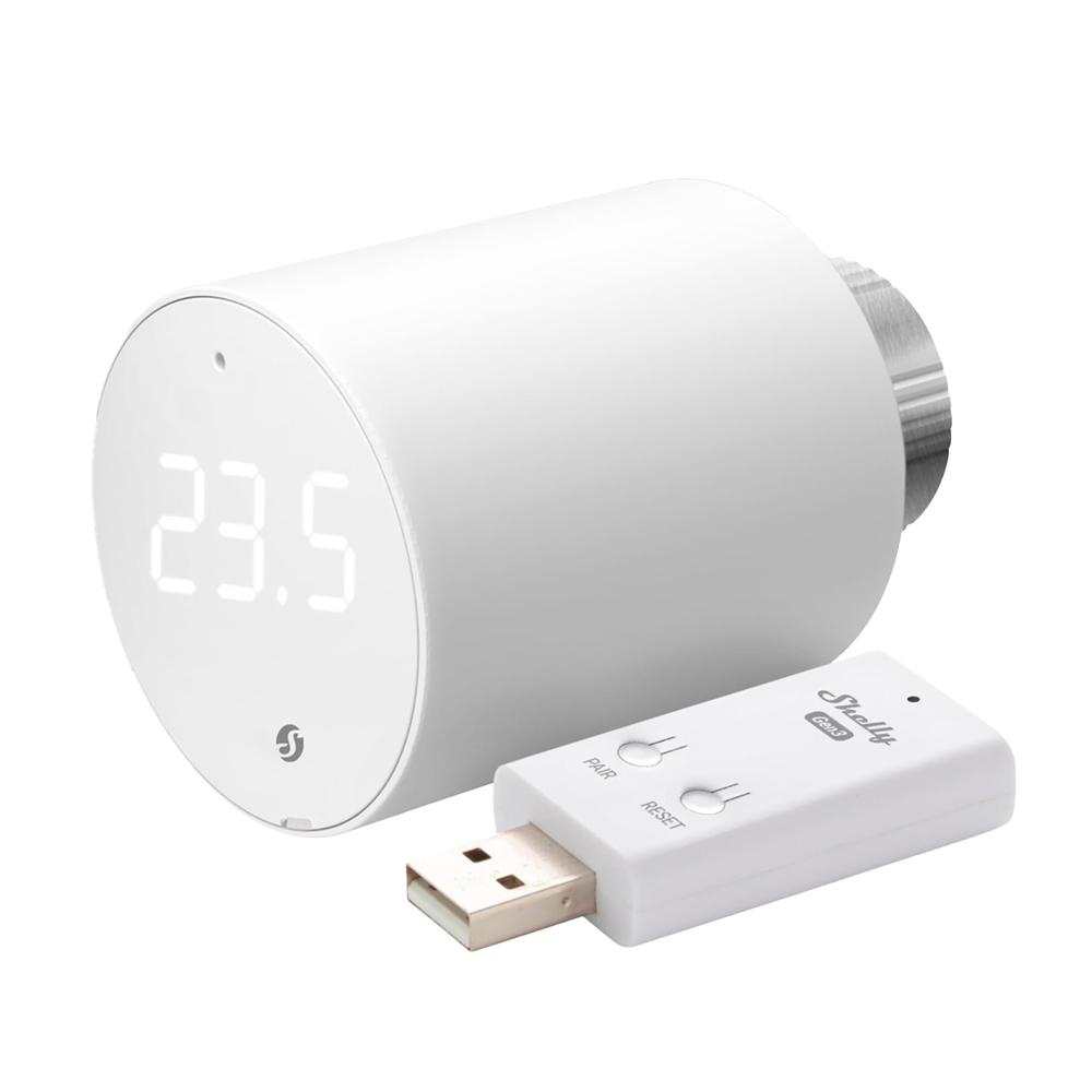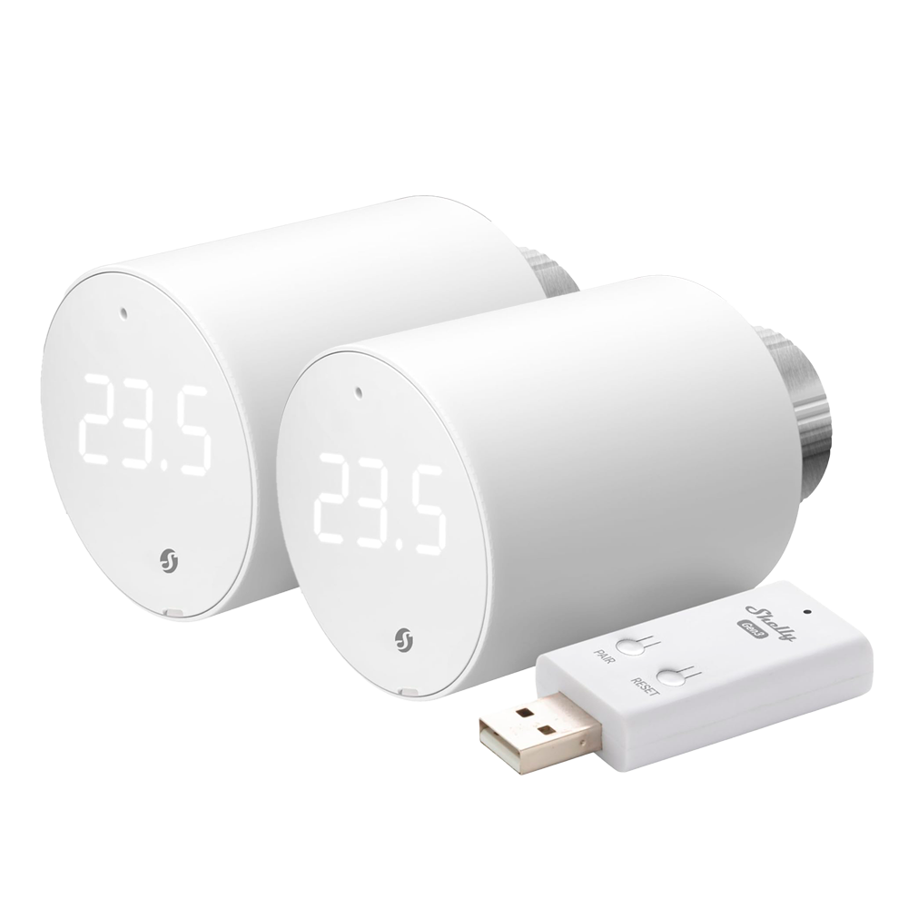 Shelly BLU TRV x2 + Shelly Blu Gateway Gen3 – WiFi 2.4 GHz IEEE802.11 b/g/n / Bluetooth – Cabezal Termostático Inteligente – Incluye HUB / Gateway – Control preciso de temperatura – Compatible con Alexa y Google