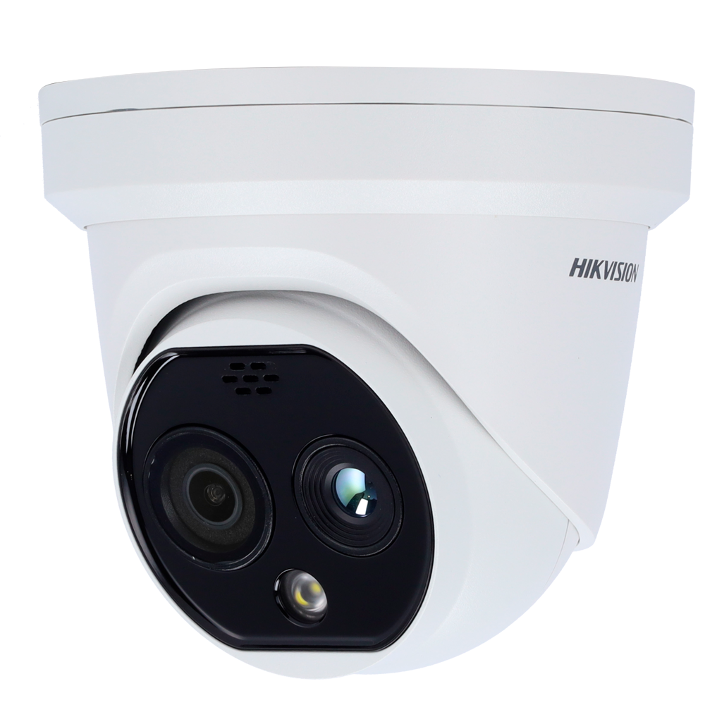 Cámara térmica Dual IP Hikvision Gama PRO – Sensor térmico 256×192 VOx | Lente 2.1 mm – Sensor óptico 1/2.7” 4 Mpx | Lente 2.2 mm – Sensibilidad térmica ≤ 40mK – Detección de preventiva de incendios y alarma – Rango medición temp -20~150ºC / ± 8ºC