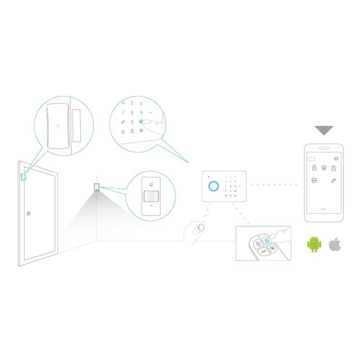 Kit de alarma doméstica – Panel táctil con módulo GSM – Envío de alertas por SMS y llamada – Detector PIR volumétrico – 2 Contactos magnéticos puerta/ventana – Incluye 2 mandos y 2 tarjetas RFID