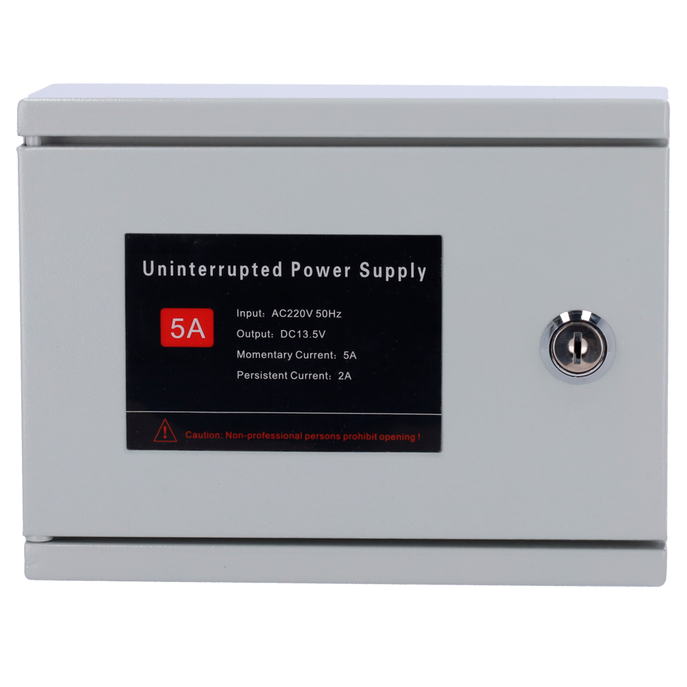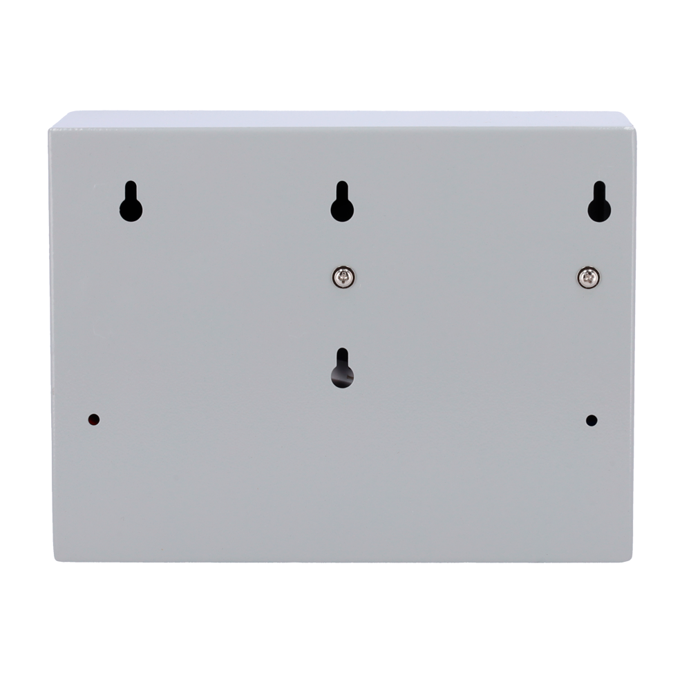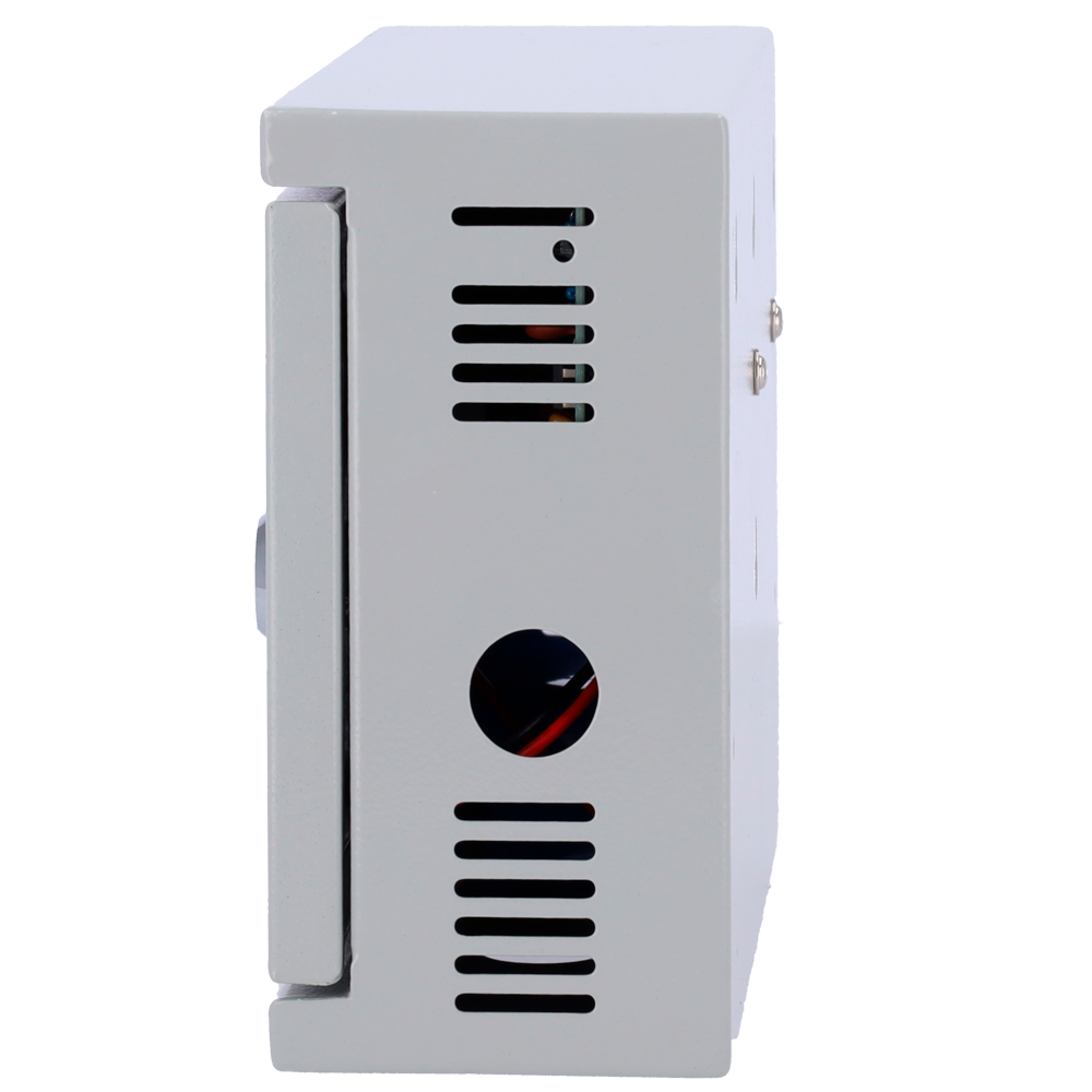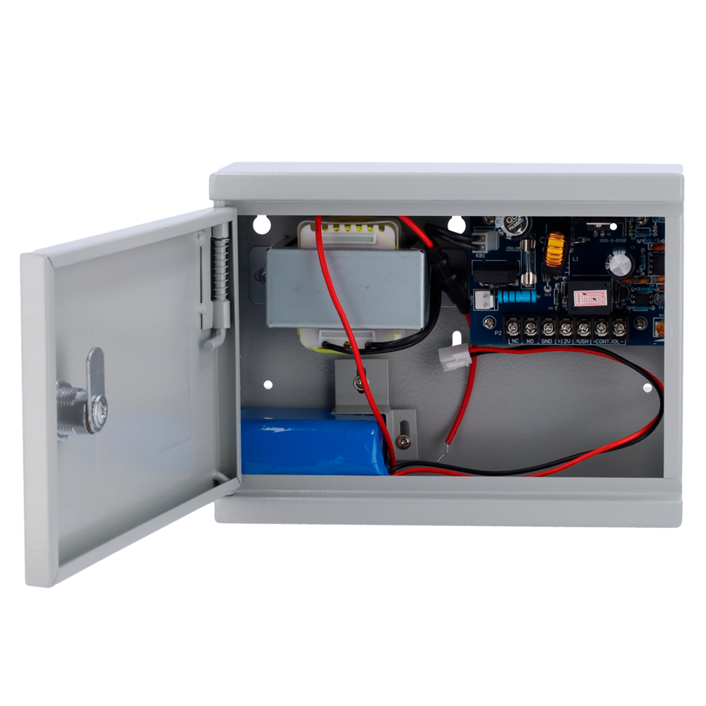 Alimentador para control de acceso – Configurable NO/NC – Salida DC 13.5V / 2A – Caja de metal con cerradura – Batería auxiliar de litio 12V / 7Ah incluída – Montaje en superficie