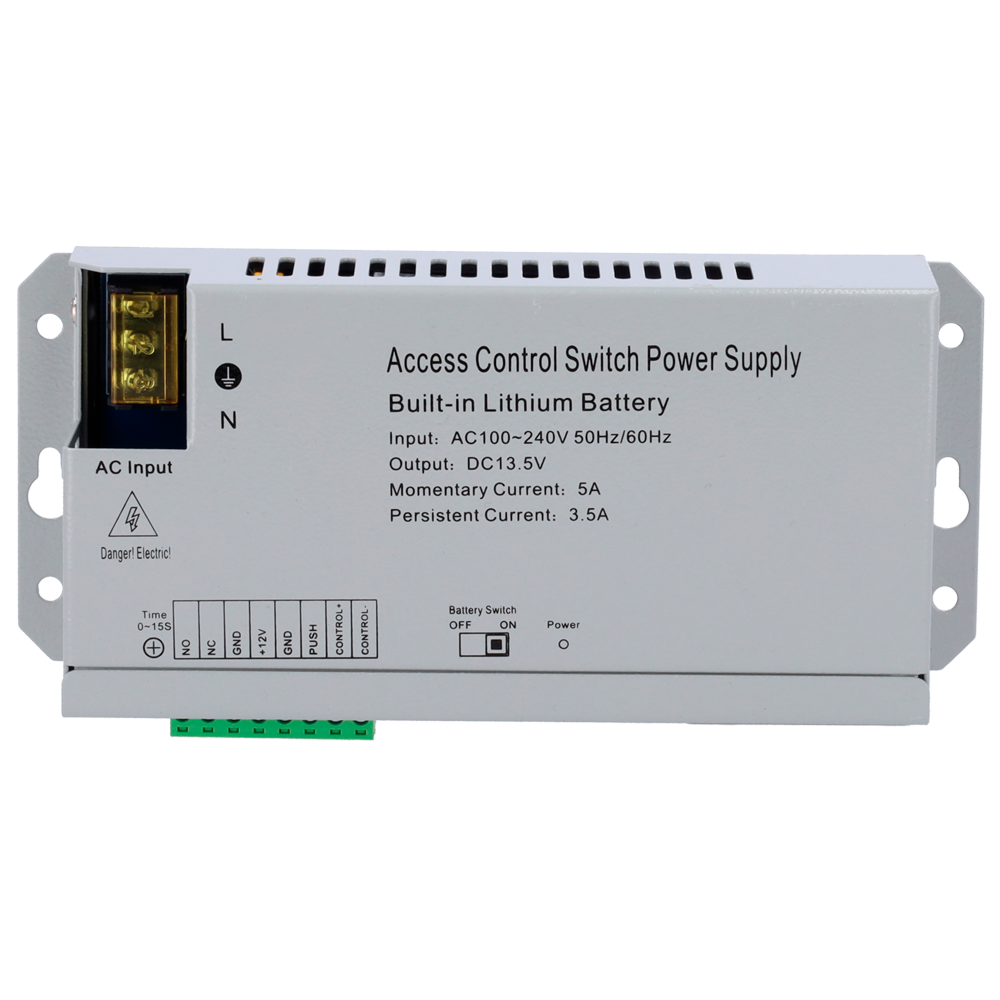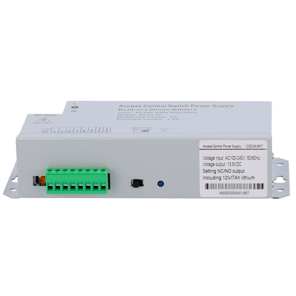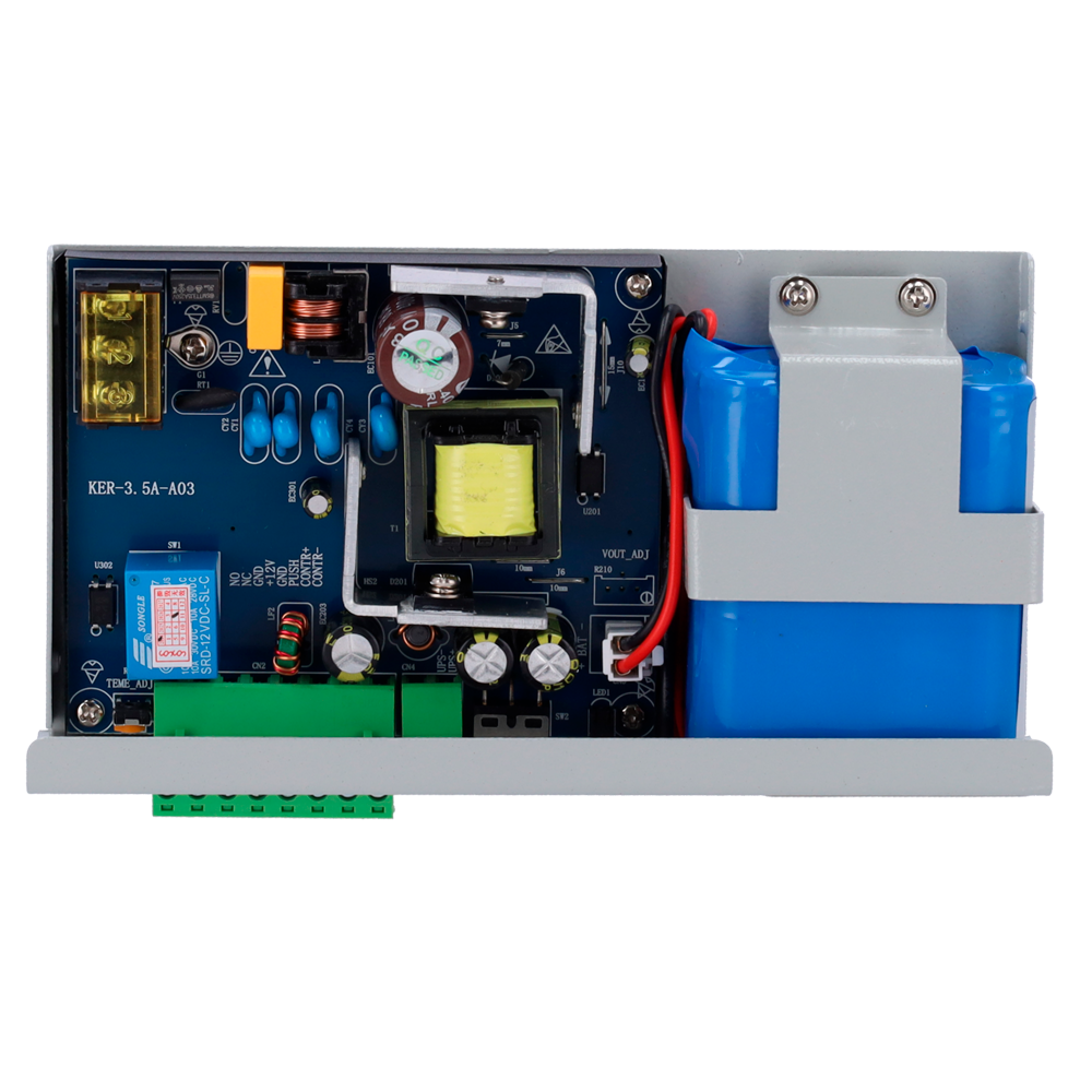 Alimentador para control de acceso – Configurable NO/NC – Salida DC 13.5V / 3.5A – Sin caja – Batería auxiliar de litio 12V / 7Ah incluida – Montaje en superficie