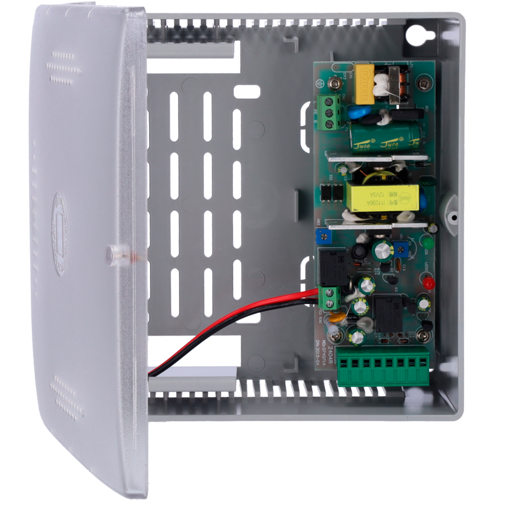 Alimentador para control de acceso – Configurable NO/NC – Salida DC 13.5V / 3A – Caja de plástico – Apto para batería auxiliar 12V / 7Ah – Montaje en superficie