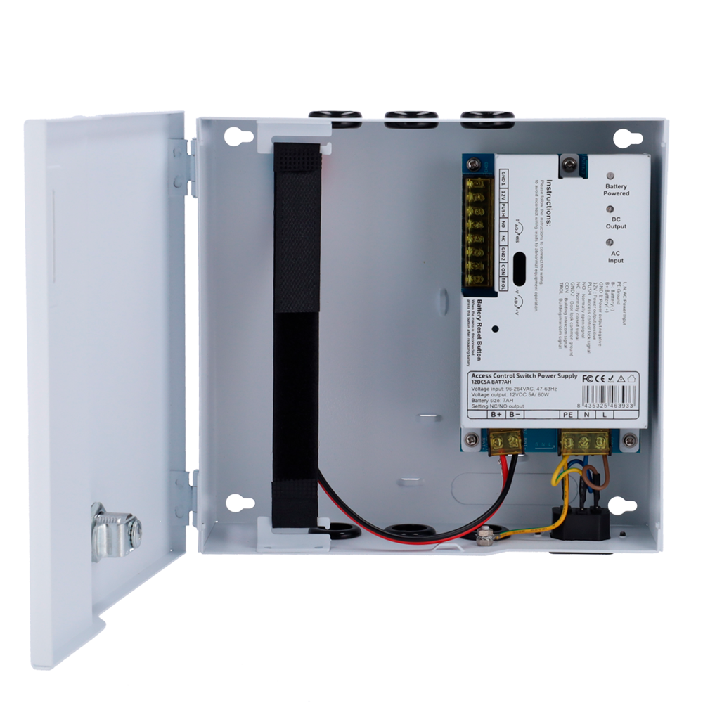 Alimentador para control de acceso – Configurable NO/NC – Salida DC 11-14V / 5A – Caja de metal con cerradura – Apto para batería auxiliar 12V / 7Ah – Montaje en superficie