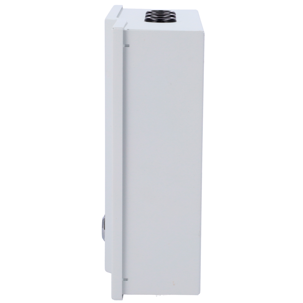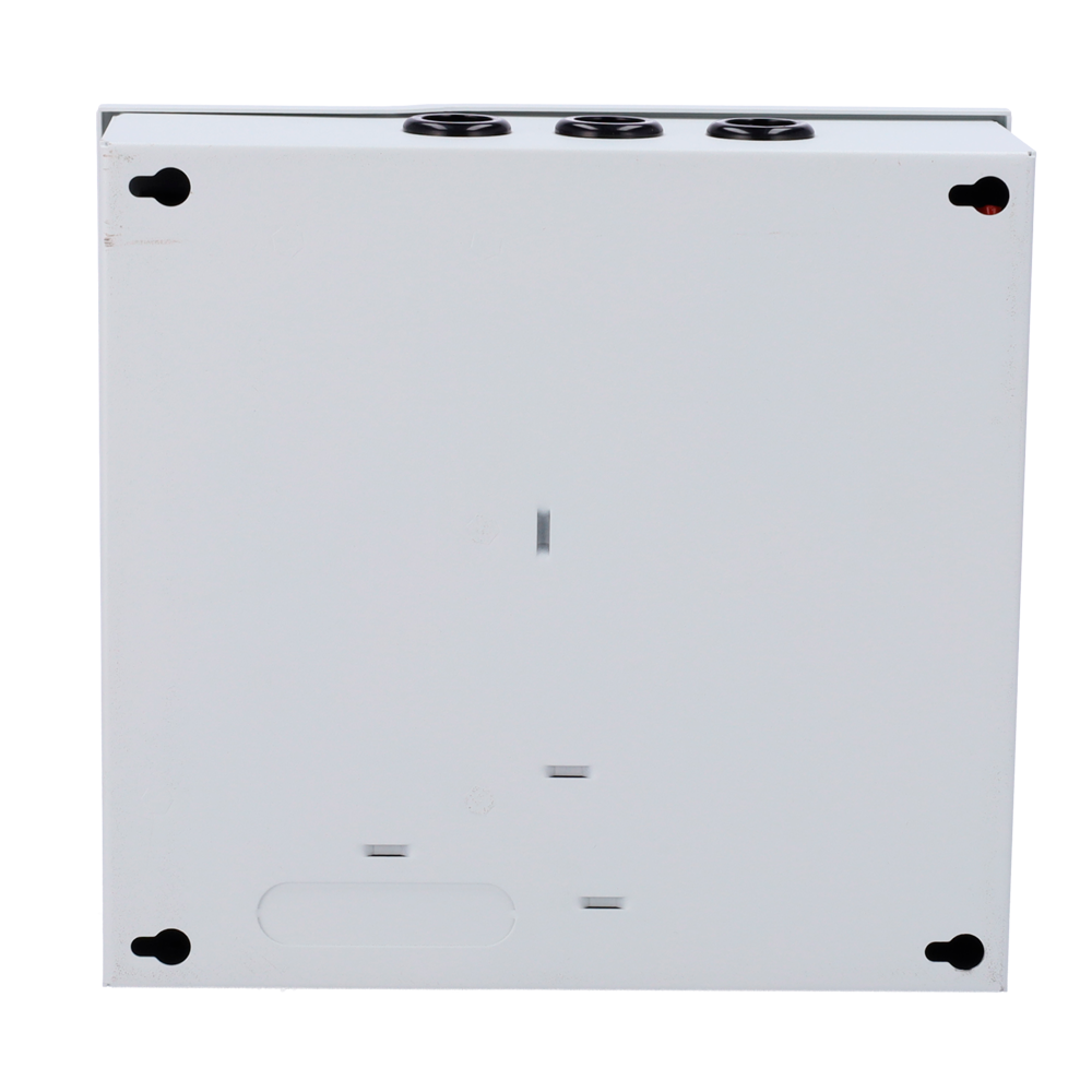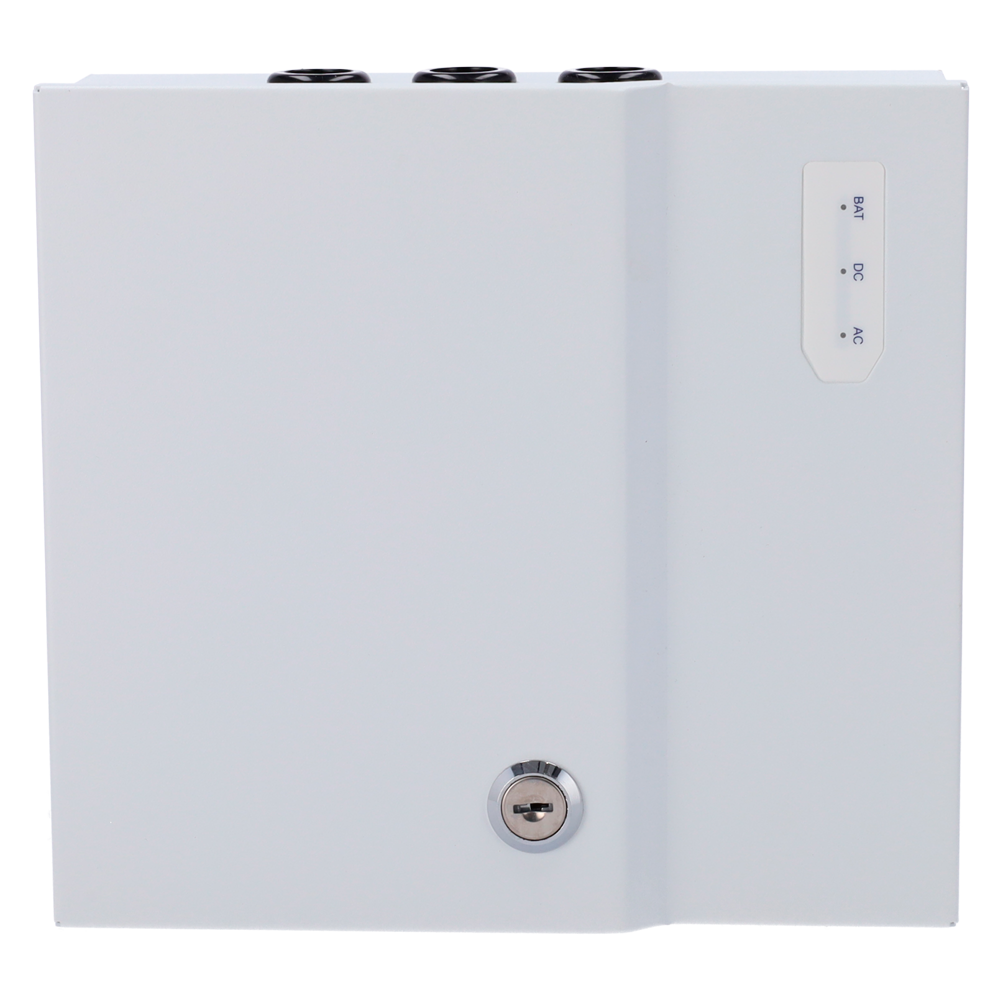 Alimentador para control de acceso – Configurable NO/NC – Salida DC 13.5V / 2A – Caja de metal con cerradura – Batería auxiliar de litio 12V / 7Ah incluída – Montaje en superficie