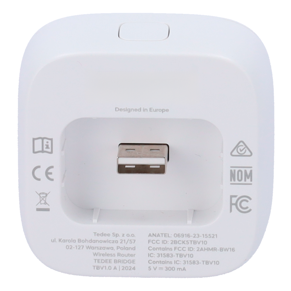 Alimentador USB – Enchufe tipo europeo – Entrada AC 100-240 V / 0.5 A – Salida USB A DC 5 V / 1 A – Potencia máxima 5 W – Compatible con TEDEE-BRIDGE-WBT