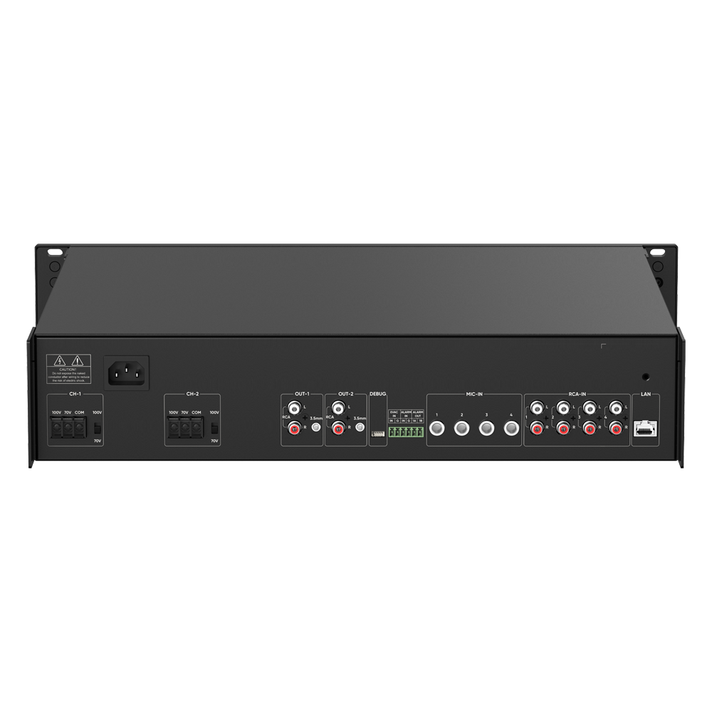 Amplificador en red – Funciones mezcladoras básicas – Amplificador 100 V – Reproductor USB / BT / MIC / RCA – Potencia nominal 500 W – Hasta 2 zonas