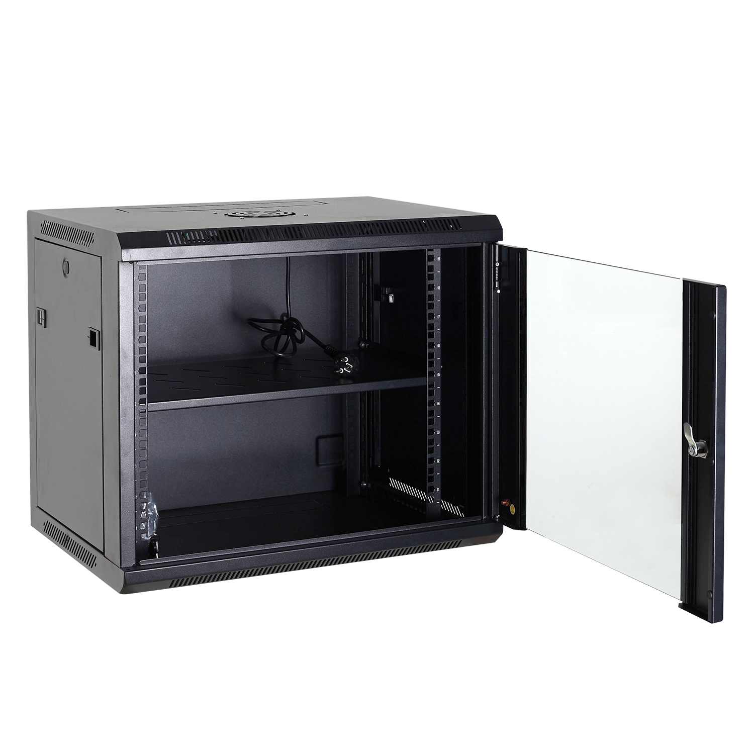 Armario rack para pared – Hasta 6U rack de 19" – Hasta 60 Kg de carga – Con ventilación y pasacables – Ventilador, bandeja y regleta 6 tomas incluidos – Se suministra desmontado
