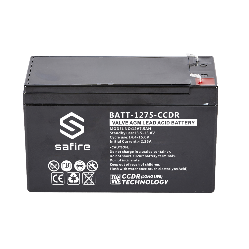 Batería recargable – Tecnología plomo ácido AGM – CCDR – Tensión 12V – Capacidad 7.5Ah – 100 x 65 x 151 mm / 2.05 Kg – Para respaldo o uso directo