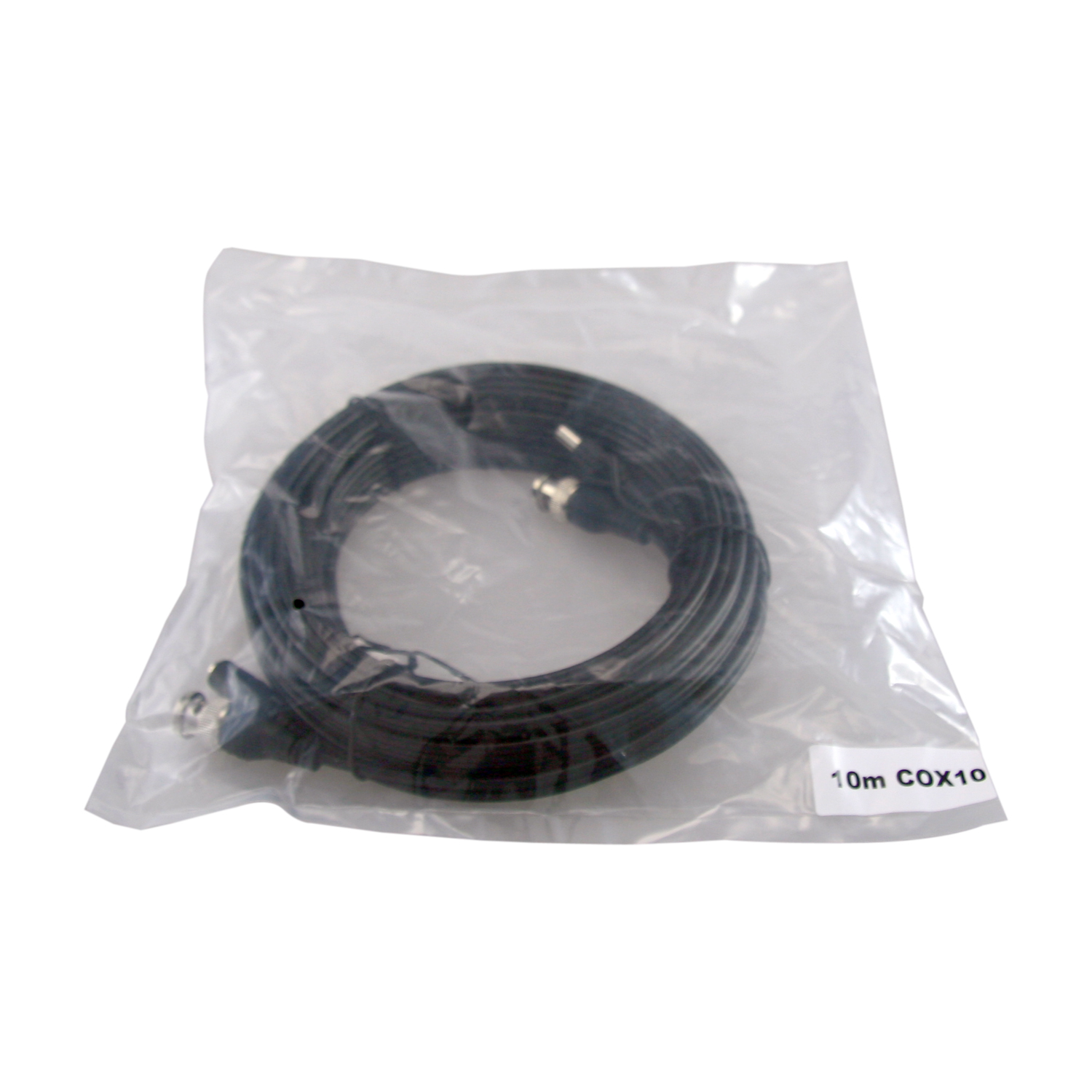 Cable coaxial SAFIRE alargador para señales de vídeo y alimentación. Cable combinado RG59 + DC. Bajas pérdidas. Longitud fija de 10 metros, con conector macho BNC de vídeo en los extremos.