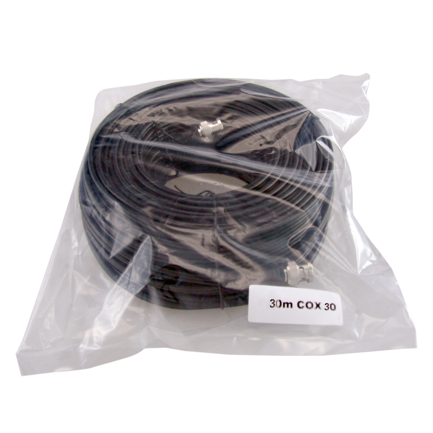 Cable coaxial SAFIRE alargador para señales de vídeo y alimentación. Cable combinado RG59 + DC. Bajas pérdidas. Longitud fija de 30 metros, con conector macho BNC de vídeo en los extremos.