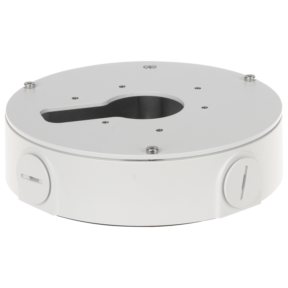 Caja de conexiones para cámaras bullet y domo – Apto para uso exterior – Instalación en techo o pared – Fabricado en plástico | Color blanco – Tapa de acceso a los cables interiores – Ø base 141.95 mm / Ø zona de montaje 116.91 mm / 47.89 (Fo) mm