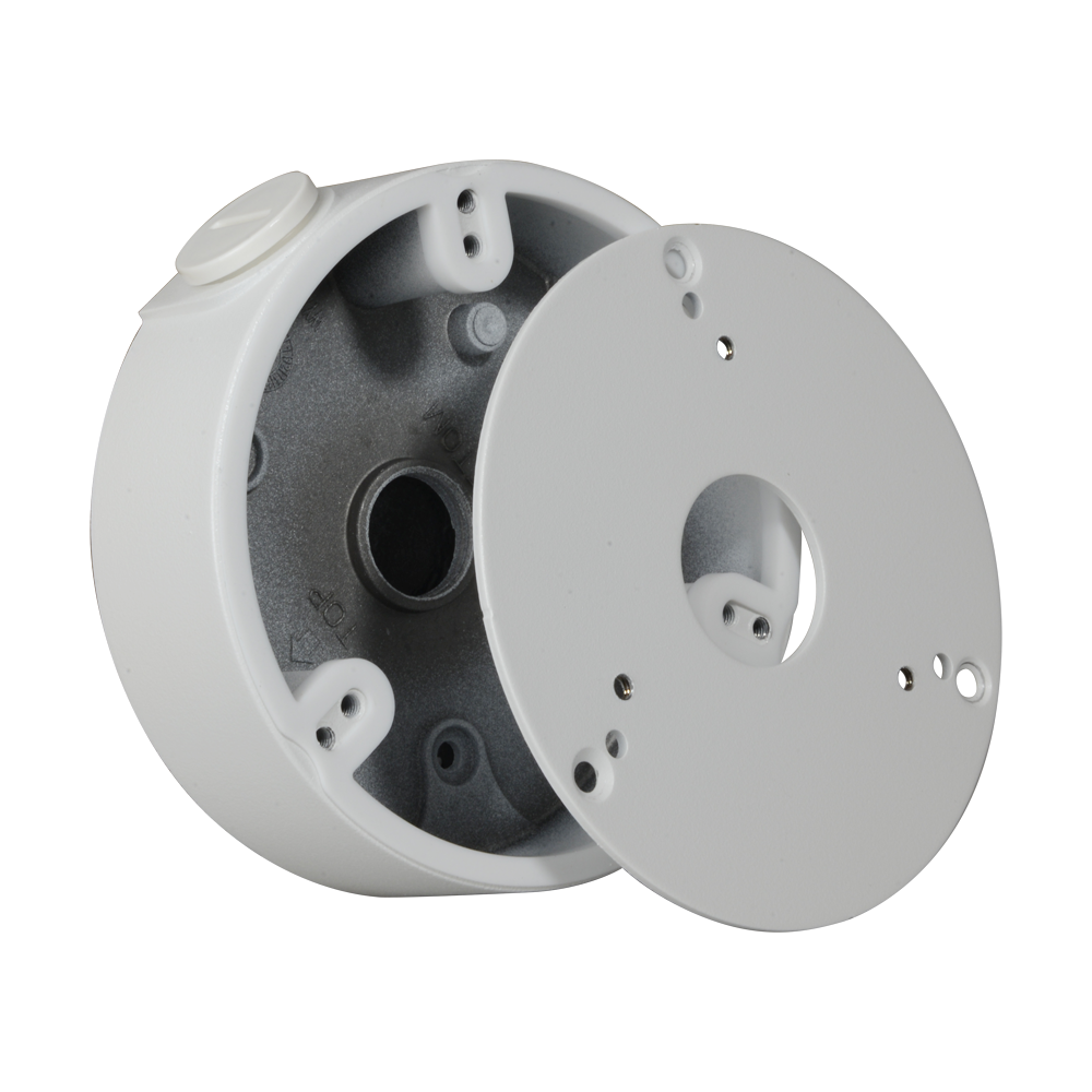 Caja de conexiones – Para cámaras domo – Doble sellado para exterior – Nivel de agua para correcto posicionamiento – Imán interior para fijar tornillos – Fabricada en plástico | Color blanco