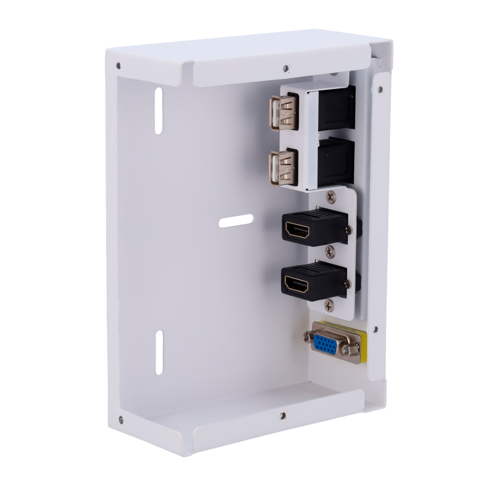 Este tipo de caja es muy utilizada en salas de reuniones, aulas o escritorios de trabajo, ya que simplifica las conexiones, evita el desorden de cables y hace más rápido el uso de dispositivos multimedia.