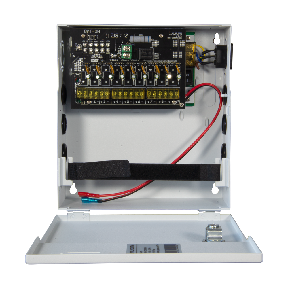 Alimentador para control de acceso – Configurable NO/NC – Salida DC 13.5V / 2A – Caja de metal con cerradura – Batería auxiliar de litio 12V / 7Ah incluída – Montaje en superficie