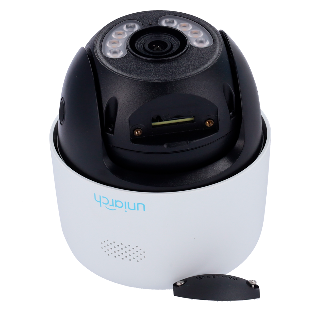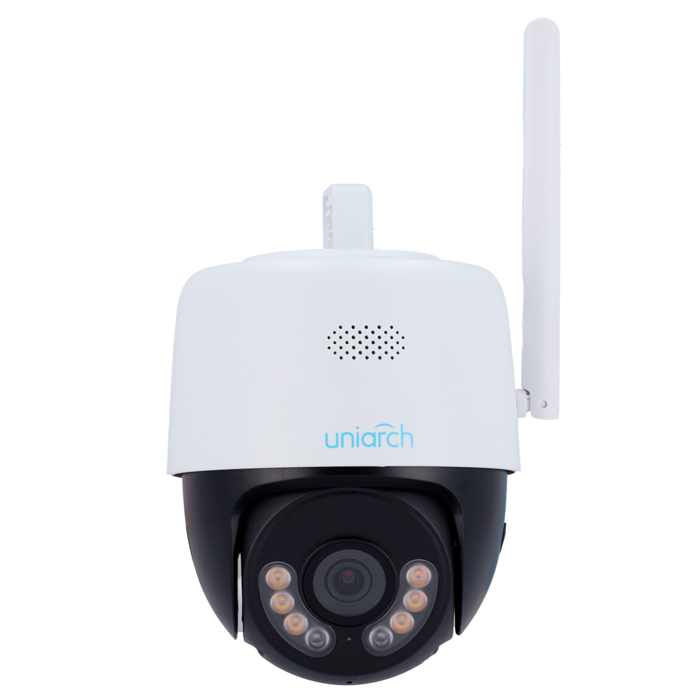 Cámara IP PTl WiFi Uniarch – 3 MP | Lente 4.0 mm | microSD 512 GB – IR 30 m | Luz blanca 10 m | DWDR – Autotracking | 20 Presets – IP67 | Wi-Fi – Mic | Altavoz | Botón de reset