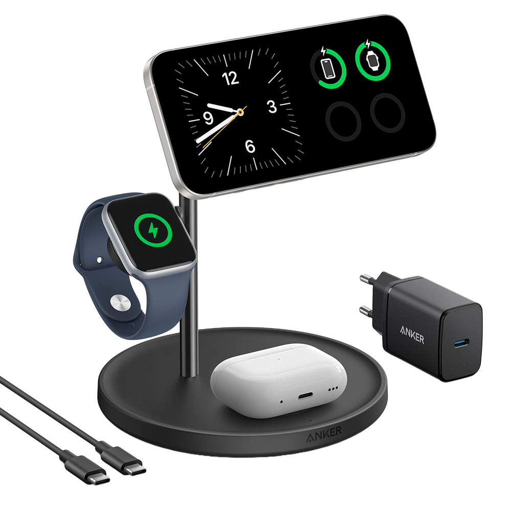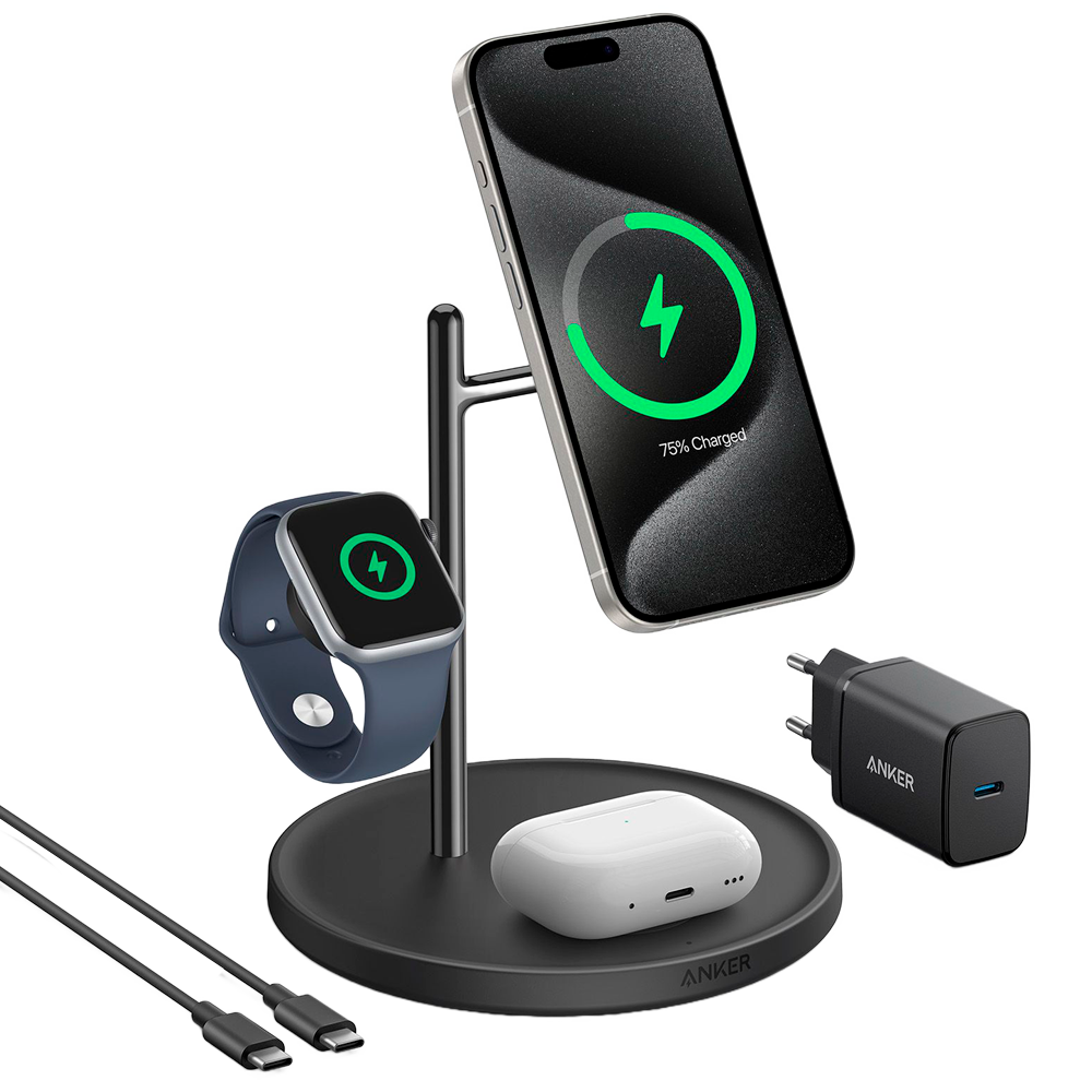 Cargador inalámbrico 3 en 1 Anker – Tecnología MagGo – Carga rápida: iPhone, Airpods, Apple Watch – Carga 3 dispositivos a la vez – Estructura para colocar dispositivos – Color negro