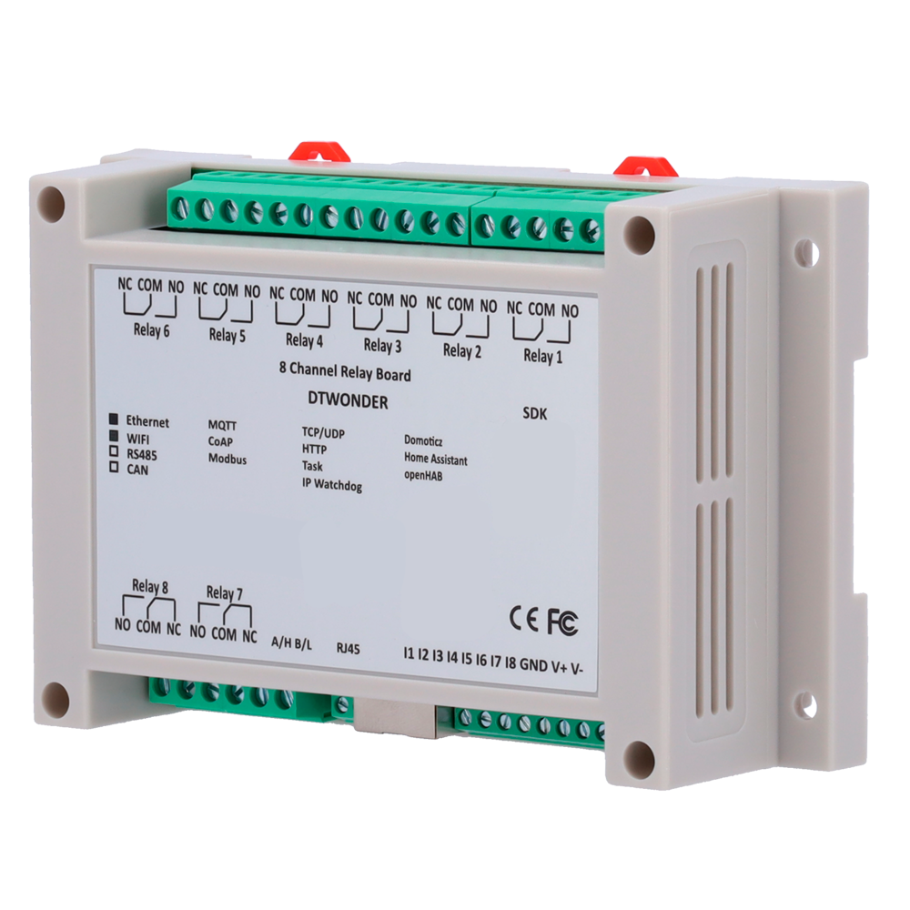Módulo de adquisición y control de datos – 8 entradas digitales | 8 salidas de relé (NO/NC) – Protocolos: Modbus/TCP, TCP/IP, UDP, HTTP,… – Servidor web integrado – Puerto Ethernet 10/100 Base-TX | Puerto WiFi – No incluye alimentador (12VDC/1A)