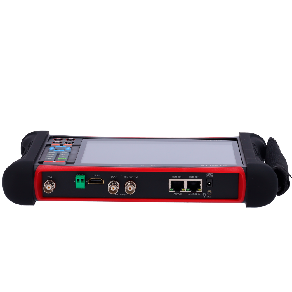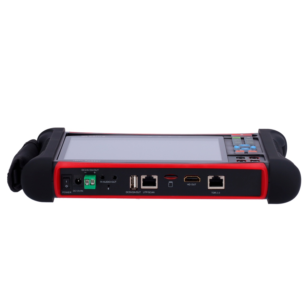 Comprobador CCTV multifuncional – Admite cámaras HDTVI, HDCVI, AHD, CVBS e IP (4K) – Pantalla LCD color 7" – Test de vídeo, audio, cables UTP y TDR – Batería integrada 5000 mAh – Conexión WiFi / Multímetro digital