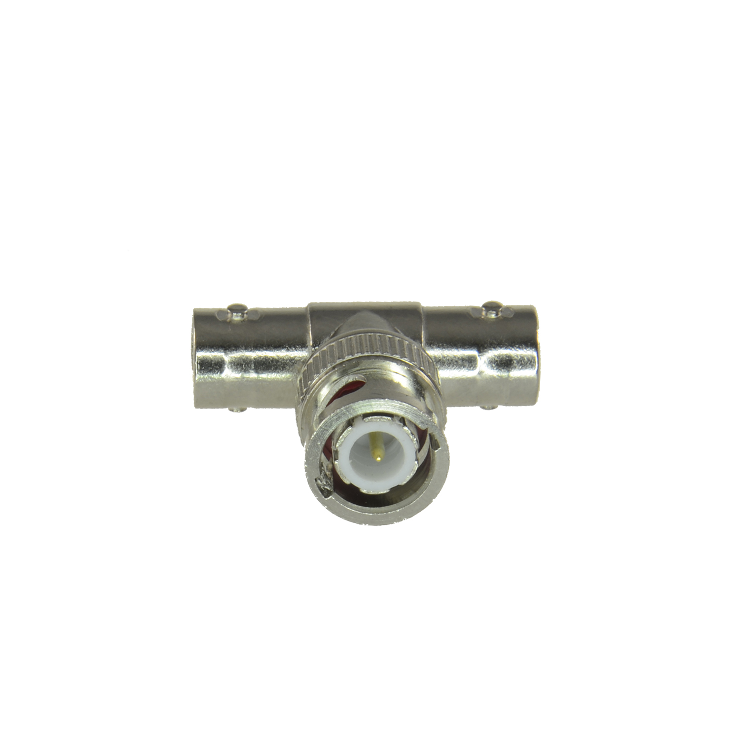 Derivador «T» BNC SAFIRE macho a 2 BNC hembra. Permite extraer la señal de un conector BNC a dos conectores, con el fin de compartir la señal.