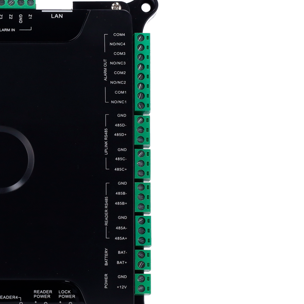 Esta controladora soporta lectores basados en el protocolo Wiegand, que permite la conexión a través de un cableado directo de cada lector a la controladora. Cuenta con 4 lectores para realizar entrada y salida en cada puerta y soporta lectores biométricos, que se conectan a través de RS485 y permiten la conexión a través de BUS (en cascada). Al soportar RS485, también soporta OSDP en el mismo conector, siendo este último personalizable en la configuración y permitiendo hasta 4 lectores por este método.
