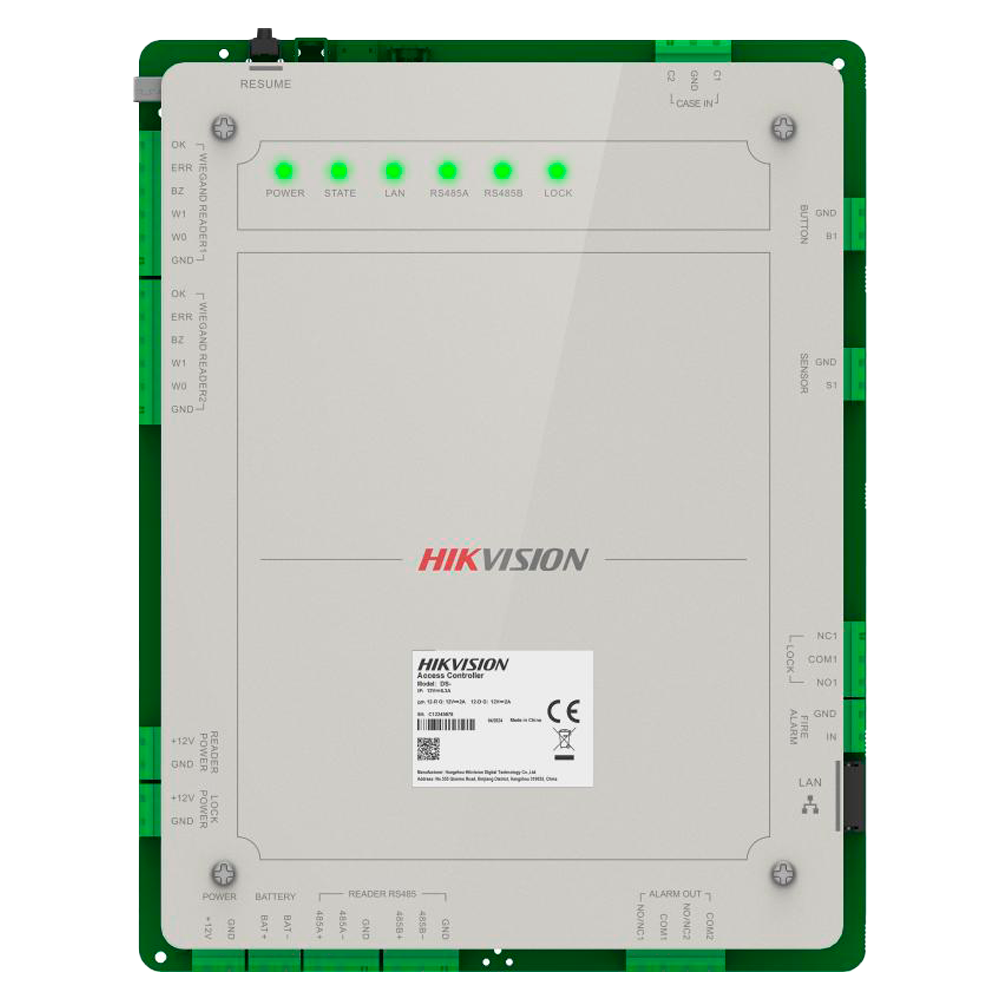 Controladora de acceso Multi-identificación – Facial, huella, tarjeta, QR o PIN – 1 puerta | Comunicación TCP/IP – 2 lectores por Wiegand | 2 lectores por OSDP – Sin caja – iVMS-4200 | Hik-Connect