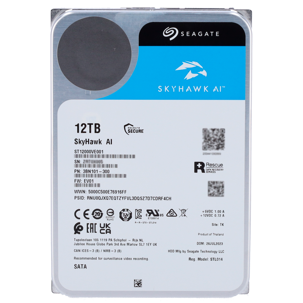 Disco duro Seagate Skyhawk AI – Capacidad 12 TB – Interfaz SATA 6 Gb/s – Hasta 32 transmisiones de inteligencia artificial – Modelo ST12000VE001 – Especial para Videograbadores de red (NVR)