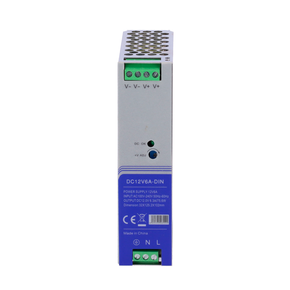 Fuente de alimentación conmutada – Salida DC 12 V 6.3 A / 75 W – Voltaje entrada AC100V-240V /50Hz-60Hz – 103 (Fo) x 125 (Al) x 33 (An) mm – Montaje en carril DIN – Protección: Sobrecarga/Sobrevoltaje/Cortocircuit