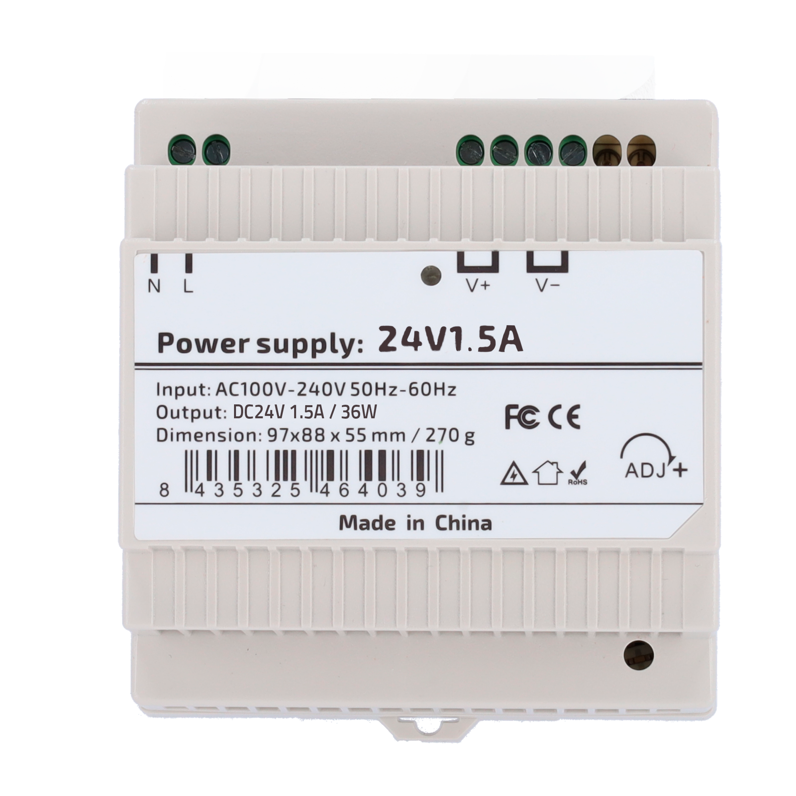 Fuente de alimentación – Salida DC 24 V 1.5 A / 36 W – Voltaje entrada AC 100V ~ 240V 50Hz-60Hz – 97 (Fo) x 55 (Al) x 88 (An) mm – Montaje en carril DIN – Protección: Sobrecarga/Sobrevoltaje/Cortocircuito