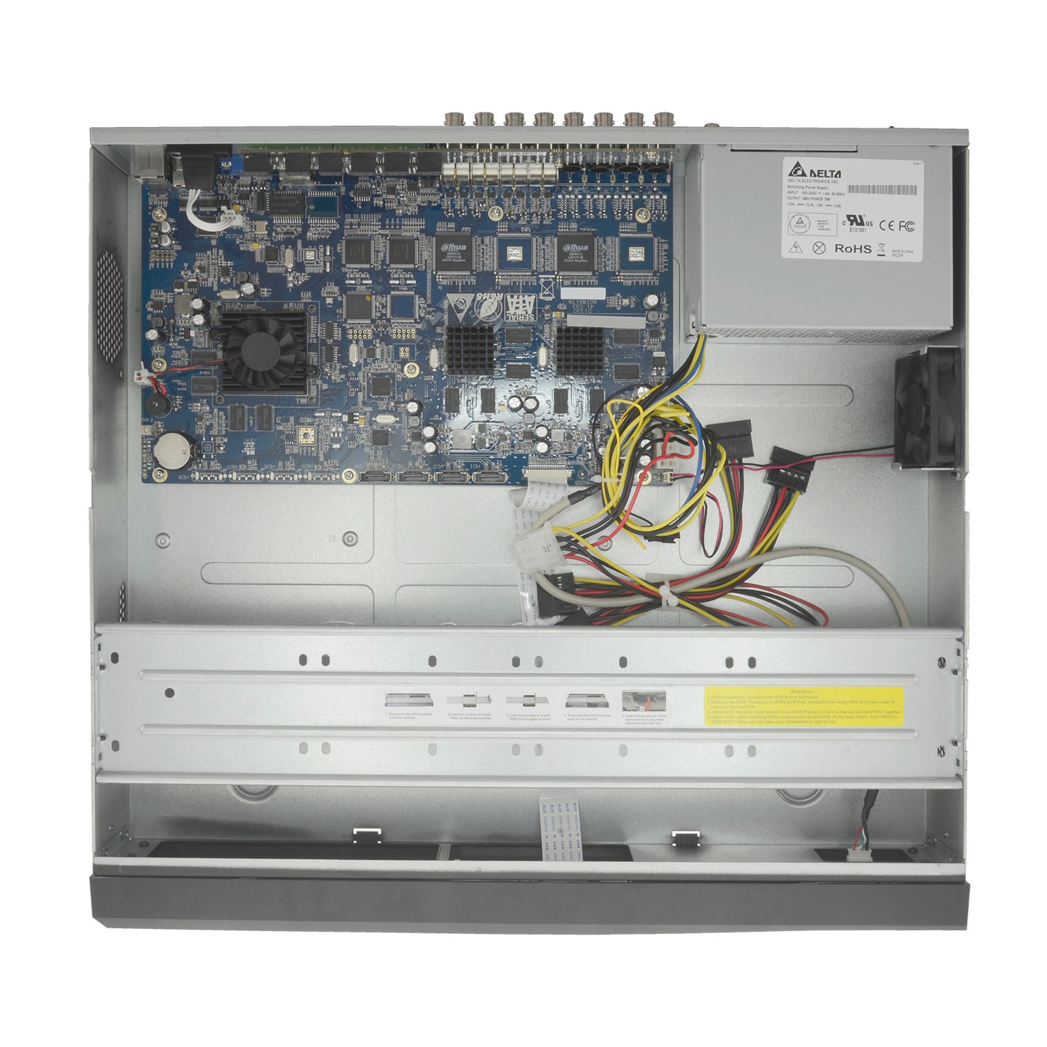 Permite utilizar indistintamente tres tecnologías en un mismo canal: HDCVI, vídeo compuesto analógico CVBS o el flujo de vídeo de una cámara IP. Dispone de 8 entradas de vídeo por conexión BNC y 4 entradas de audio por conexión BNC. Cuenta con 1 salida de audio BNC y 4 salidas de vídeo: una salida de vídeo compuesto BNC, una salida VGA y una salida HDMI Full HD todas simultaneas, junto con una salida HDMI Full HD adicional independiente. Sistema operativo Linux empotrado, con multitarea péntaplex que permite: visualización en directo, grabación, reproducción, backup y acceso remoto al mismo tiempo.