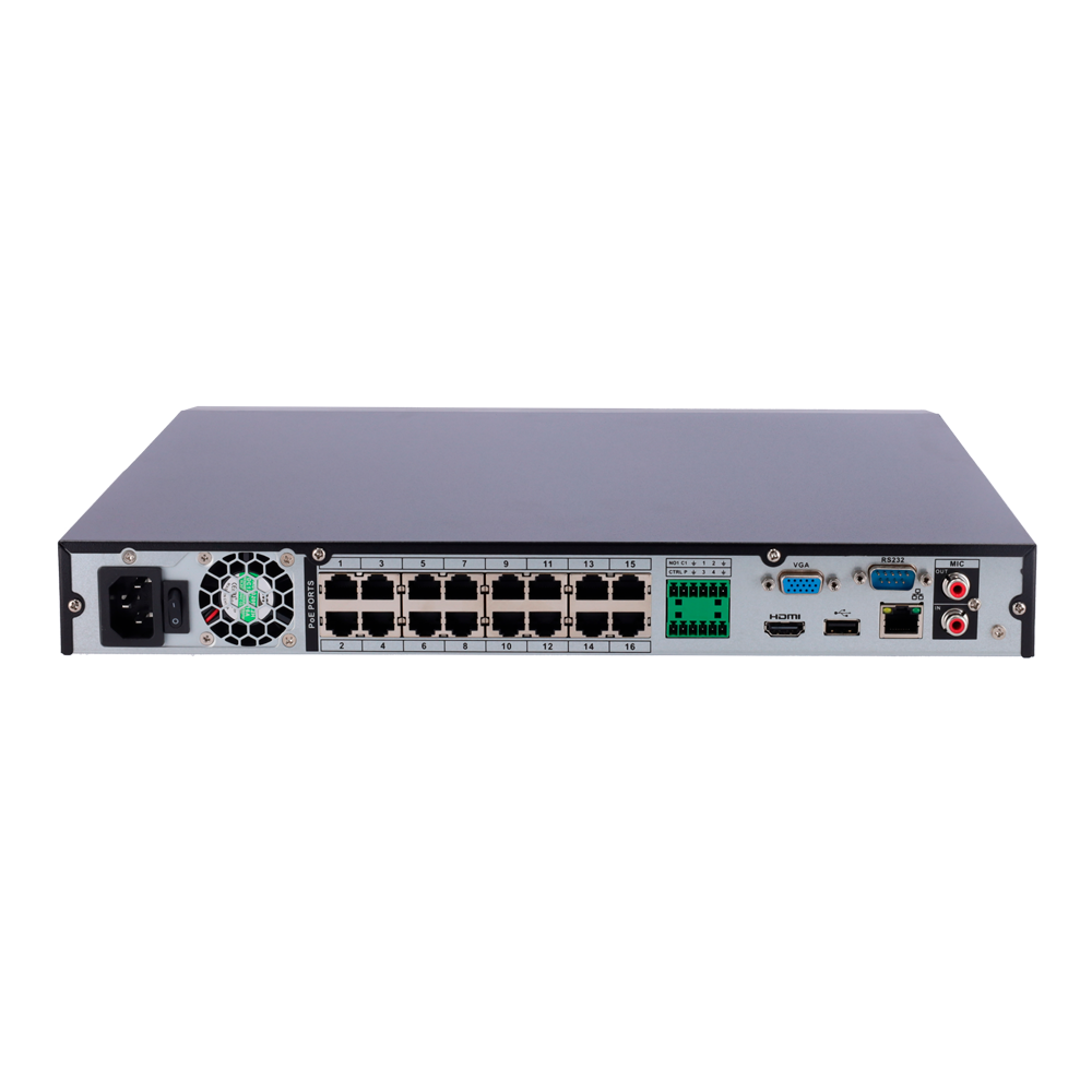 Grabador NVR – 16 canales – Compresión H.265 / H.264 – Resolución hasta 4K (25/30 FPS) – Ancho de banda 100Mbps – Espacio para 1HDD de hasta 16 TB