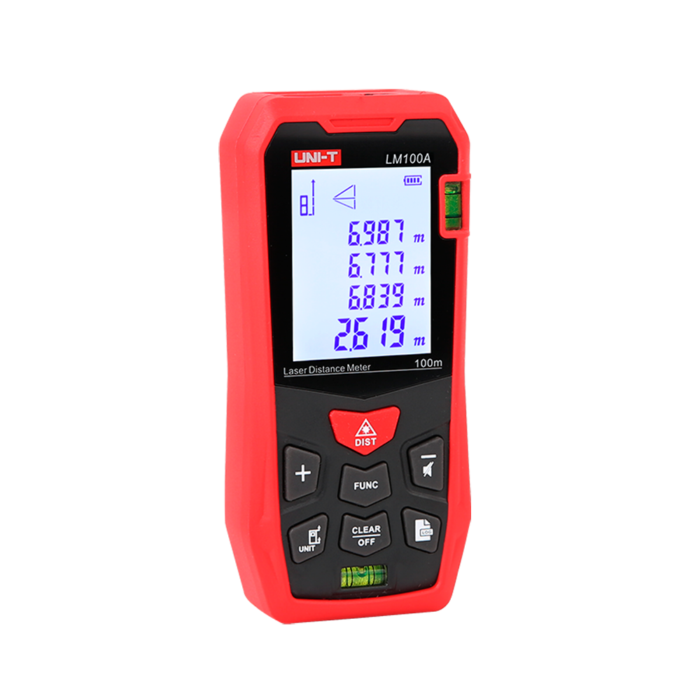 Medidor láser de distancia – Rango de hasta 100 m con precisión milimétrica – Medición de longitud, área, volumen – Diseño ergonómico y confortable – Almacenamiento de hasta 99 conjuntos de datos – Contiene nivelador de burbuja