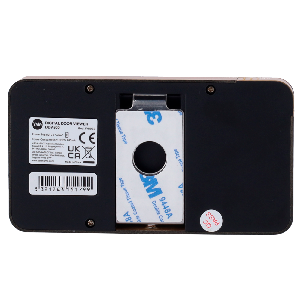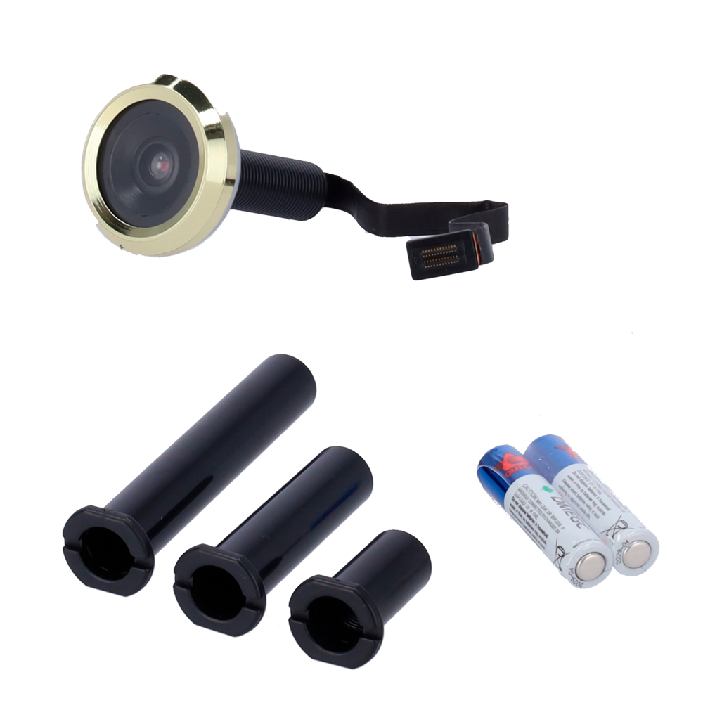 Mirilla digital – Cámara 0.3 Mpx | Ángulo de visión 105º – Pantalla LCD TFT 3.2" – Puertas con espesor entre 38 y 110 mm – Alimentación con baterías AAA – Color oro