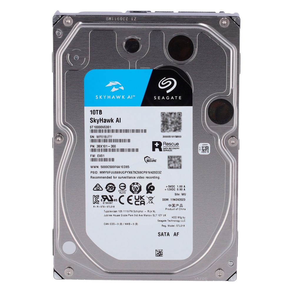 Modelo ST10000VE001 del fabricante Seagate. Diseño optimizado para los sistemas NVR con inteligencia artificial (IA) para aplicaciones de seguridad perimetral.