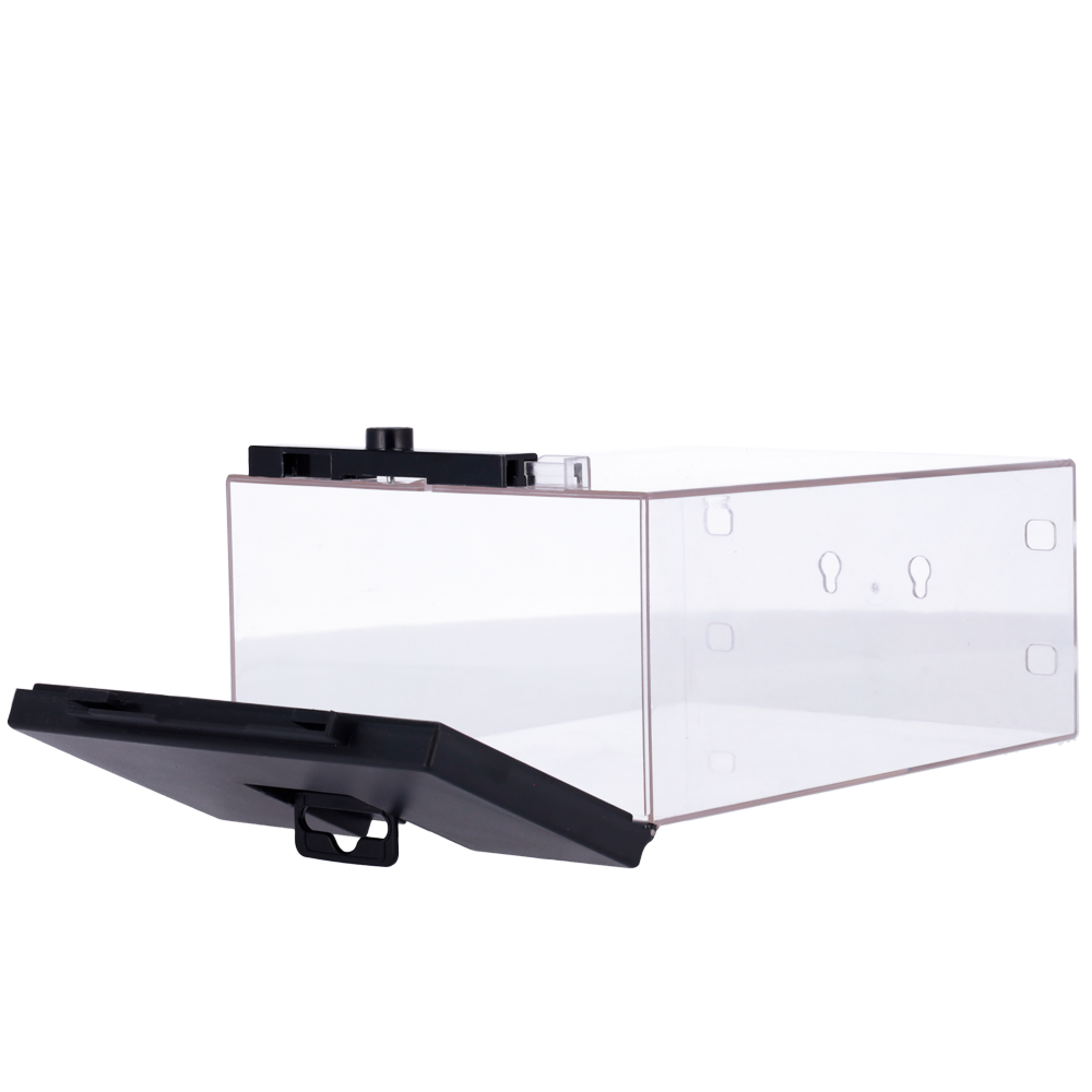 Protección electrónica antihurto EAS – AM 58 kHz | Desbloqueo magnético – Caja transparente de policarbonato – Medidas int.: 205 (An) x 155 (Al) x 85 (Fo) mm – Medidas ext.: 210 (An) x 160 (Al) x 95 (Fo) mm – Compatible con antenas AM