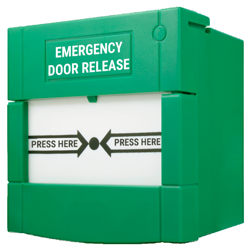 Pulsador de liberación de puerta – Botón de doble polo | Texto en inglés – Testado 100.000 usos – NO/NC/COM | Re-armable desde interior – Medidas 86 (Al) x 86 (An) x 50 (Fo) mm – Apto para puertas de emergencia
