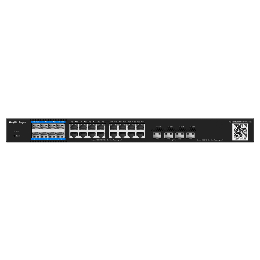 Reyee E-Lighten Switch Cloud Capa 3 – 16 puertos RJ45 Gigabit + 4 puertos SFP+ 10 Gbps – 8 Puertos SFP E-Lighten (PON/Ethernet) – Static LAG/DHCP Snoop/IGMP Snoop/Port Mirror – VLAN/Port Isolation/STP/RSTP/ACL/QoS/802.1X – Servidor DHCP/Rutas estáticas/RIP/OSPF/SNMP