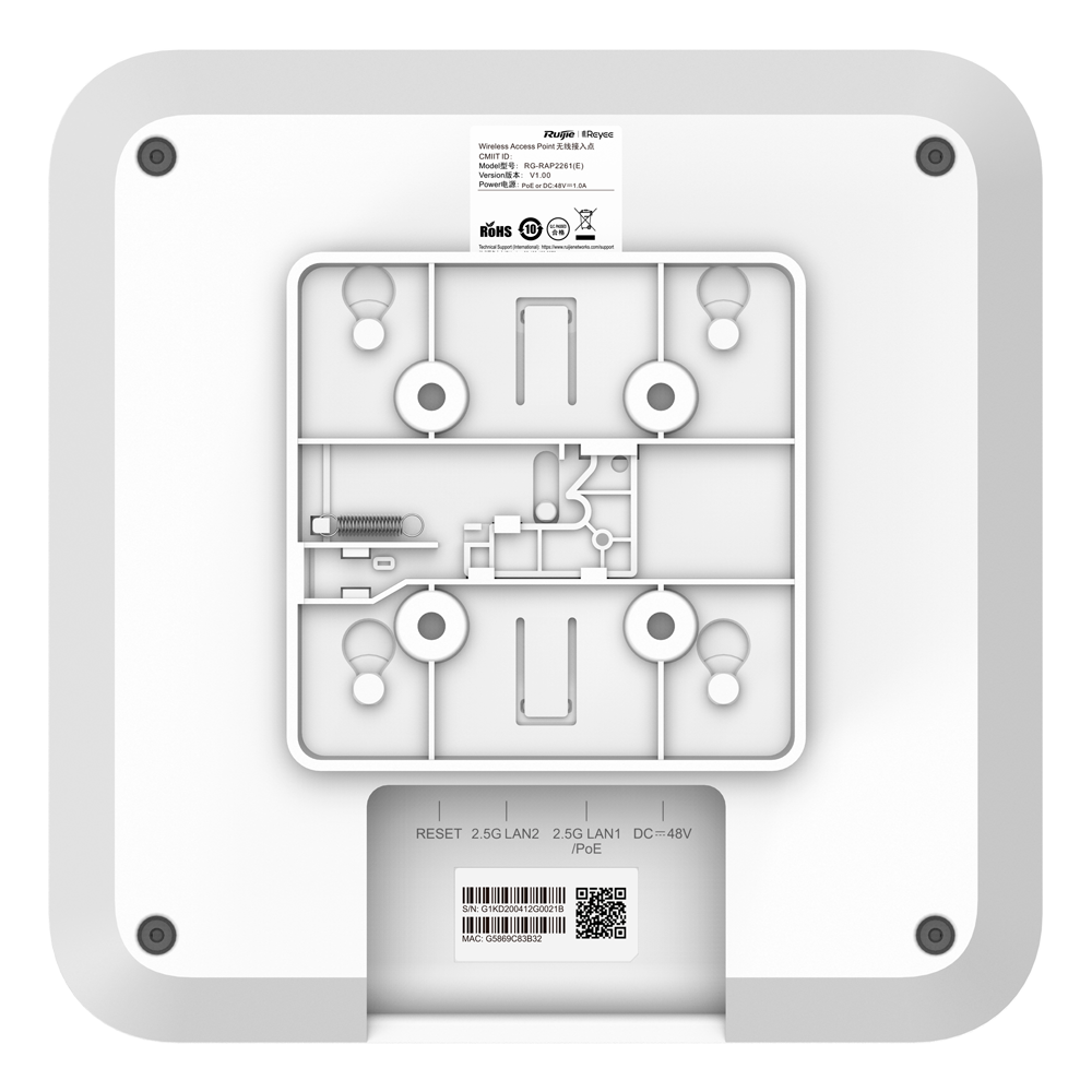 Reyee – AP de Pared Omnidireccional Wi-Fi 6 – Frecuencia 2.4 y 5 GHz / 160MHz Ancho de Canal – Rendimiento Wi-Fi hasta 3000 Mbps – Antenas MU-MIMO 2×2 en 2.4GHz, 2×2 en 5GHz – Instalación cajas mecanismo / 4 Puertos RJ45