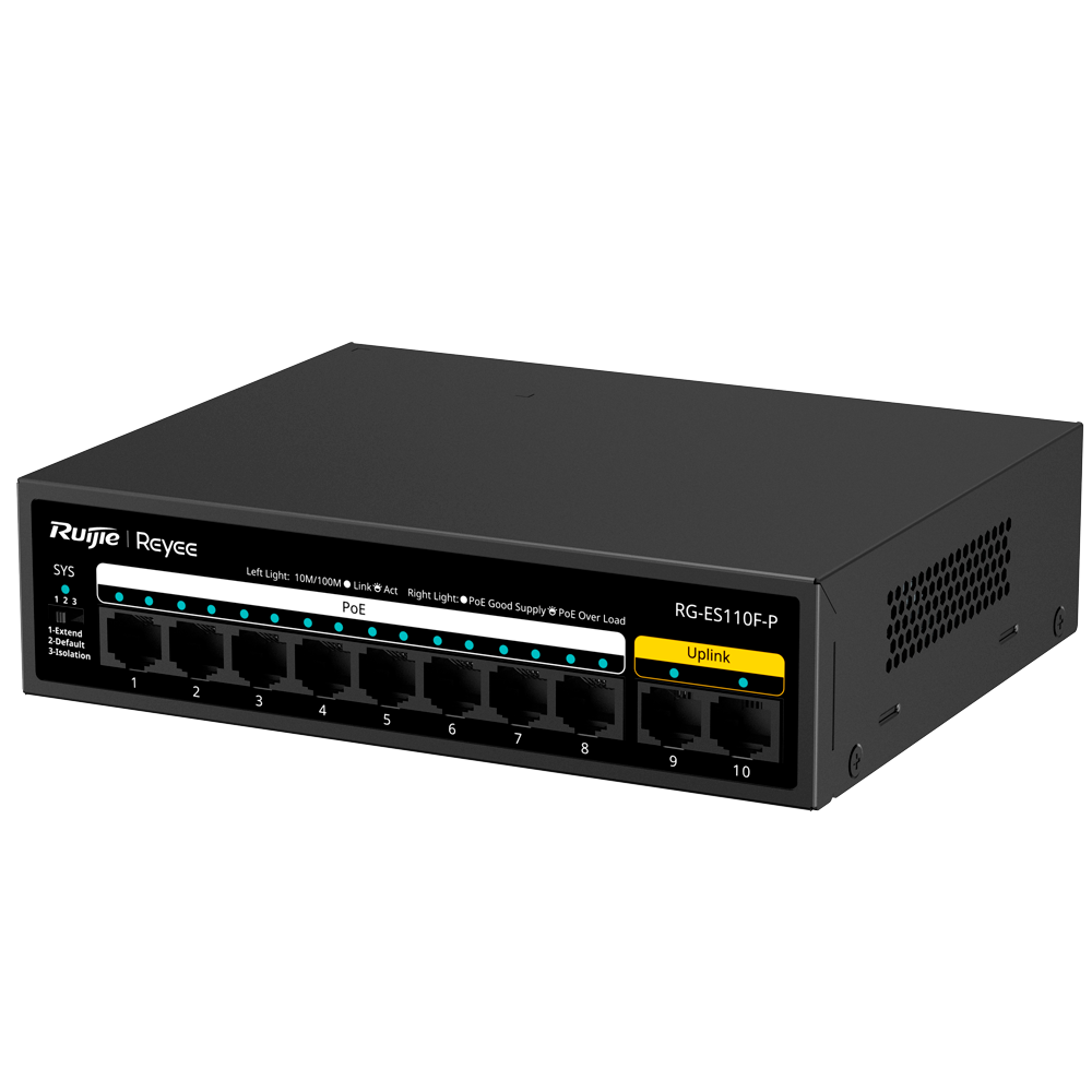 Reyee Switch PoE Sobremesa – Carcasa Metal – 8 puertos RJ45 10/100 Mbps PoE+ 802.3af/at – 2 Puertos Uplink RJ45 10/100 Mbps – Plug and Play – Tecnología de ahorro de energía