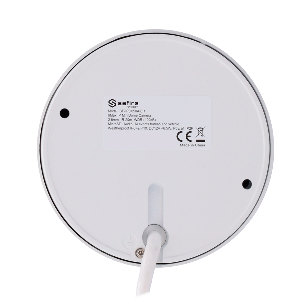 Safire Smart – Cámara MiniDomo IP gama I1 AI Avanzada – Resolución 6 Megapíxel (3296×1856) – Lente 2.8 mm | Micrófono | IR 20m – AI Avanzada:Humano, vehículo y vehículo 2 ruedas – Impermeabilidad IP67 | PoE (IEEE802.3af)