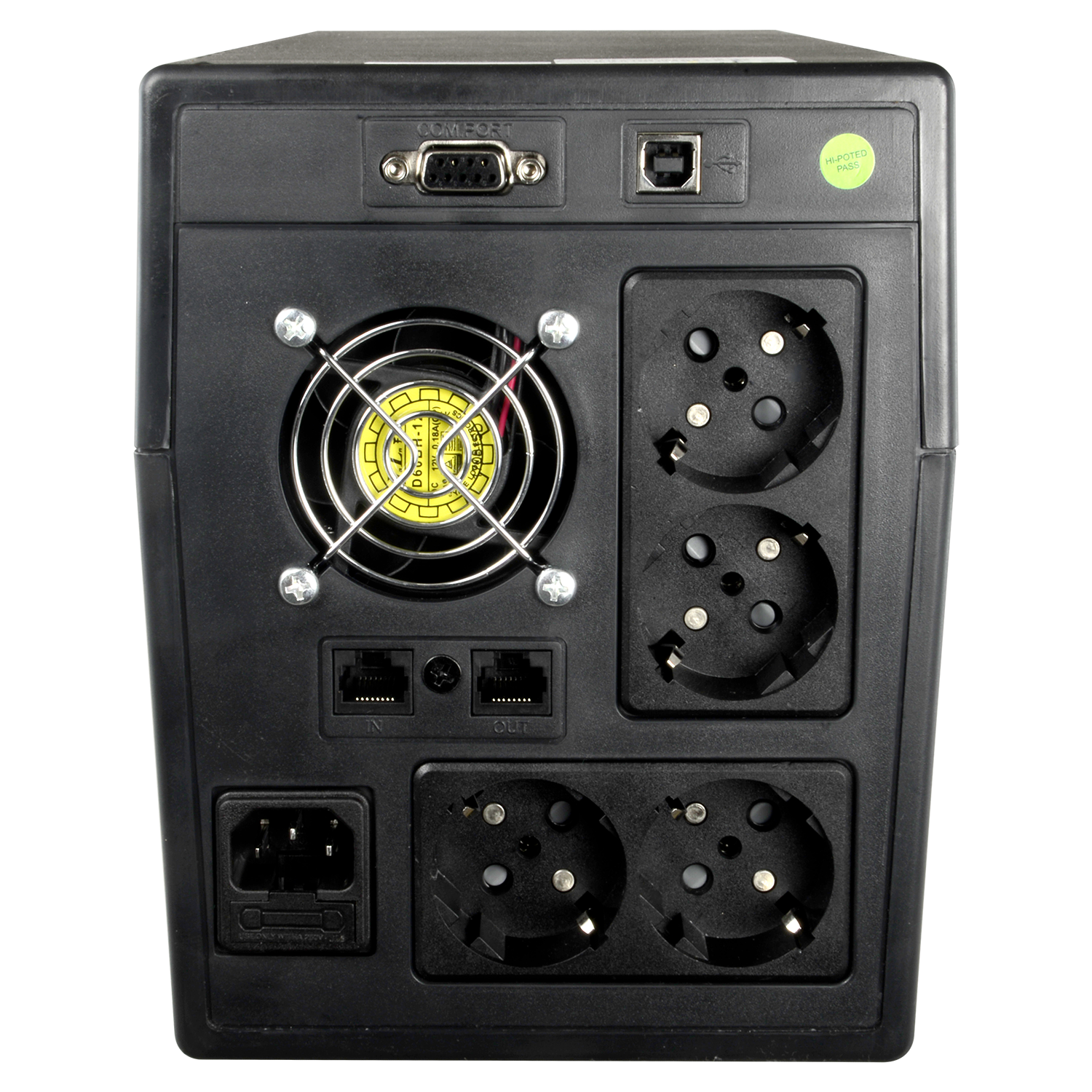 SAI monofásico line-interactive – Potencia 1500VA/900W – Entrada 220~240 Vac /Salida 230 Vac – 4 salidas SAI/UPS protegidas – Tiempo de recarga 6~8 h – 2 baterías de plomo-ácido selladas (incluidas)