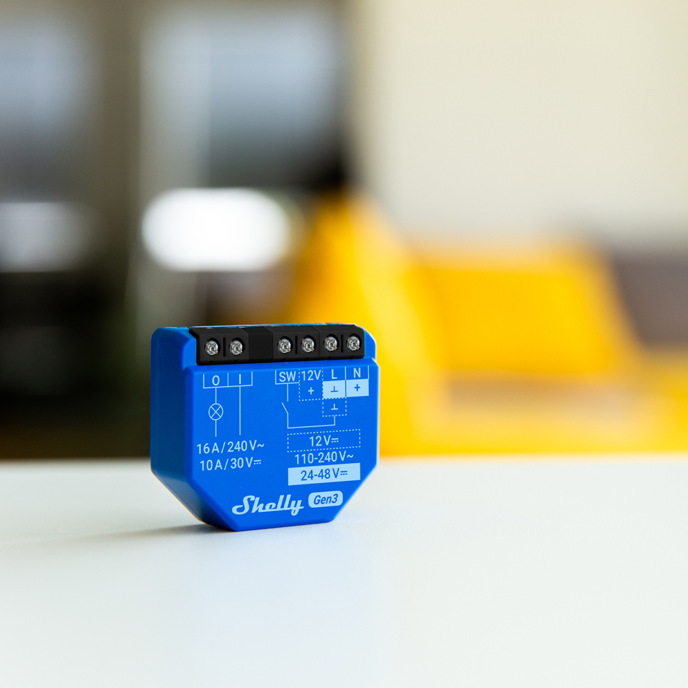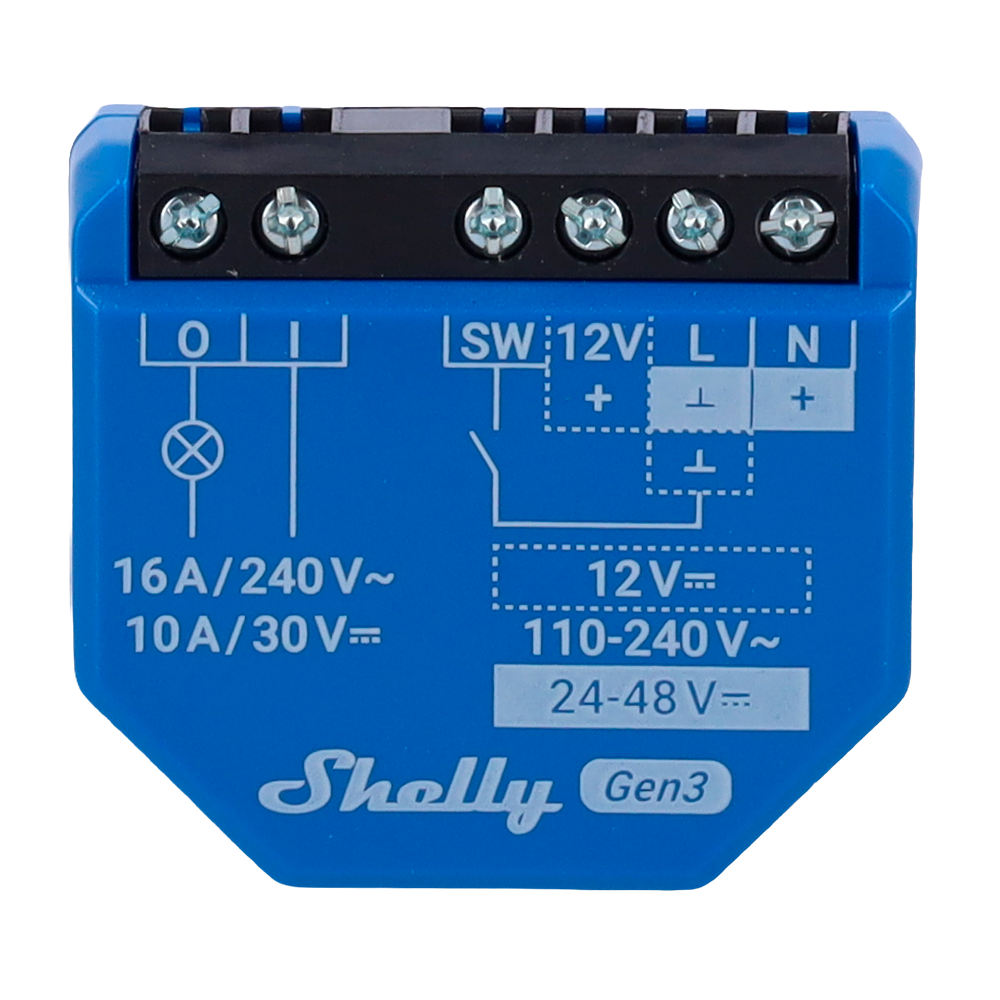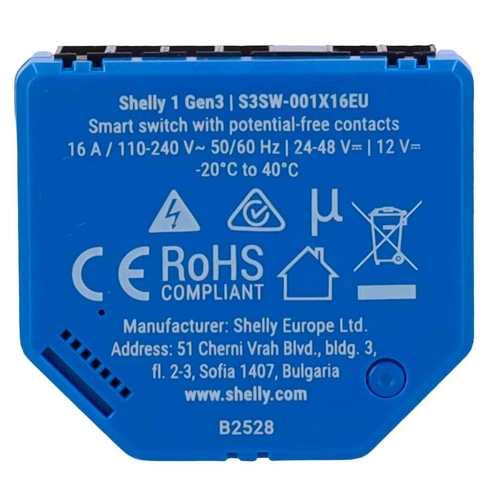 Shelly 1 Gen3 – WiFi 2.4 GHz IEEE802.11 b/g/n / Bluetooth – Interruptor inteligente – Soporta 110-240 V~24-48 V⎓12 V⎓ – Ofrece contactos secos – Compatible con Alexa y Google
