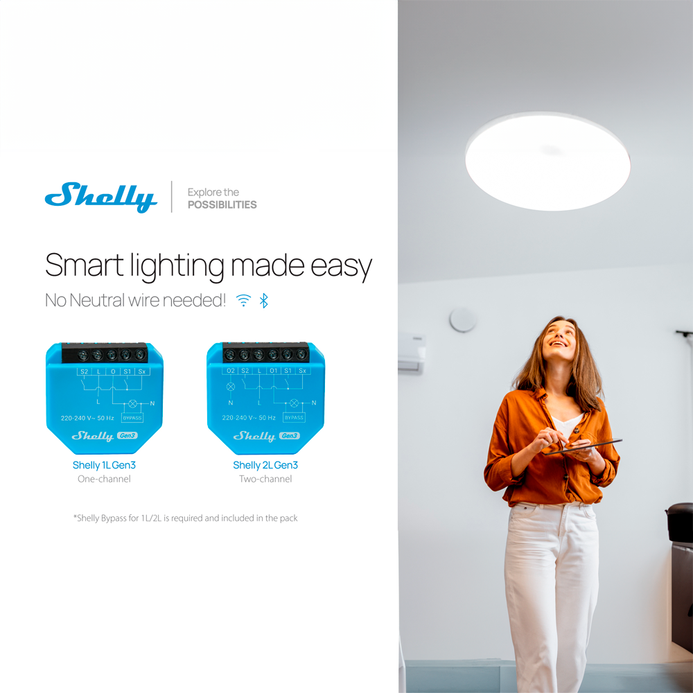 Shelly 2L Gen3 – WiFi 2.4 GHz IEEE802.11 b/g/n / Bluetooth – Interruptor inteligente / Sin Neutro – Soporta 220-240 V~50Hz – Bypass 1L/2L – Compatible con Alexa y Google