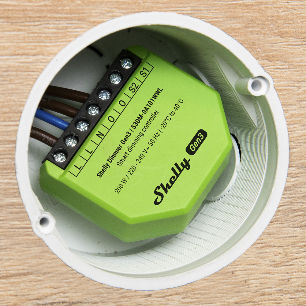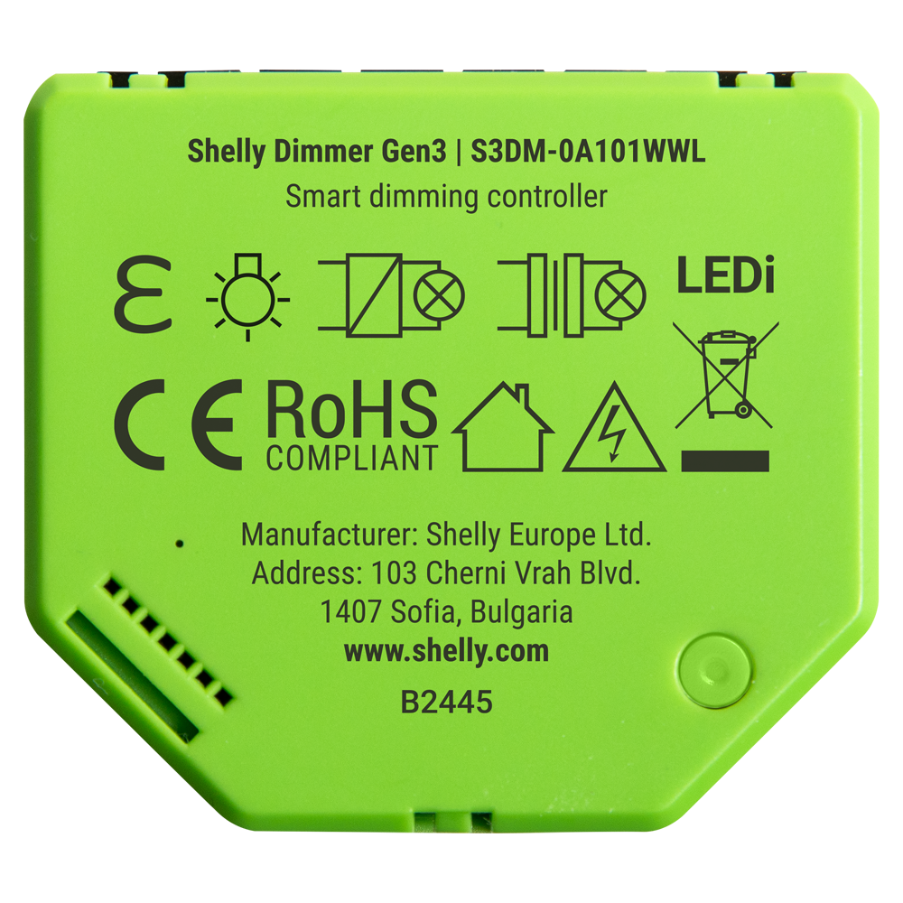 Shelly Dimmer Gen 3 – WiFi 2.4 GHz IEEE802.11 b/g/n / Bluetooth – Regulador intensidad de luz – Soporta 110-230 V – Funciona con neutro / sin neutro – Compatible con Alexa y Google