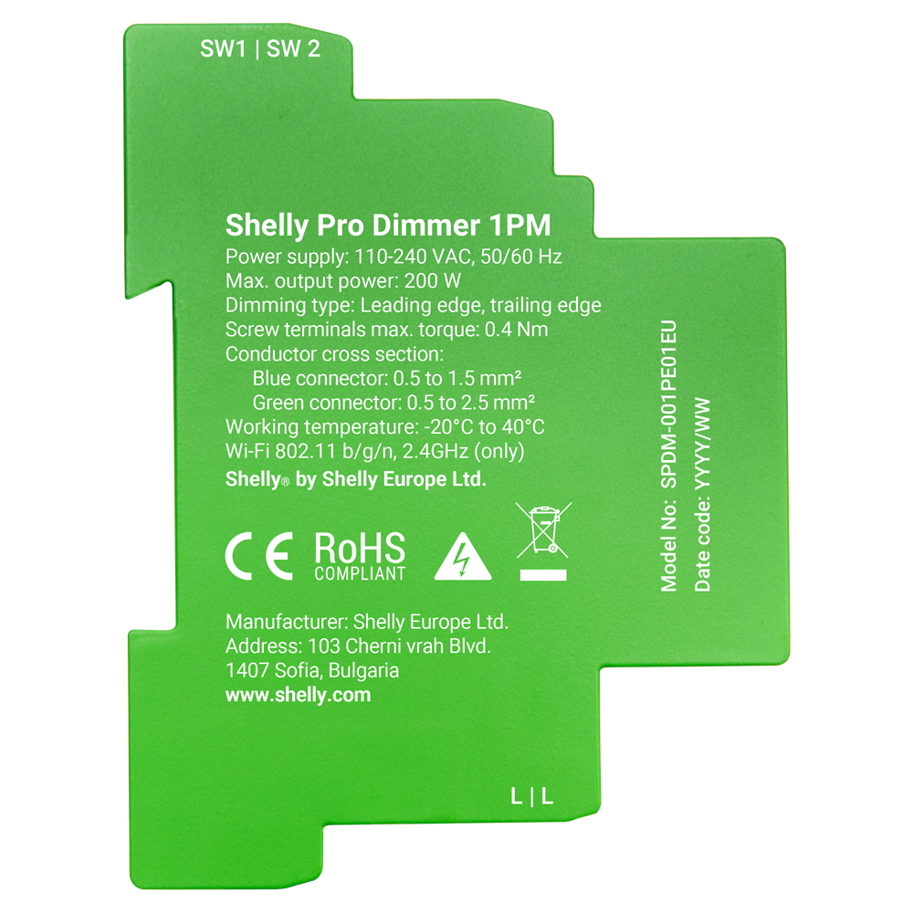 Shelly Pro Dimmer 1PM – WiFi 2.4 GHz IEEE802.11 b/g/n / Bluetooth – Atenuador inteligente carril DIN – Soporta 110-240 V – Medidor de potencia – Compatible con Alexa y Google
