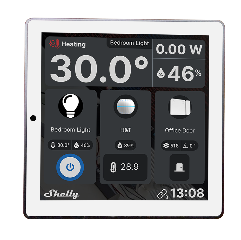 Shelly Wall Display Blanco + BLU H&T Ivory – WiFi 2.4 GHz / Bluetooth – Sensor H&T – Resistente al agua y al polvo – Batería de hasta 3 años – Compatible con Alexa y Google